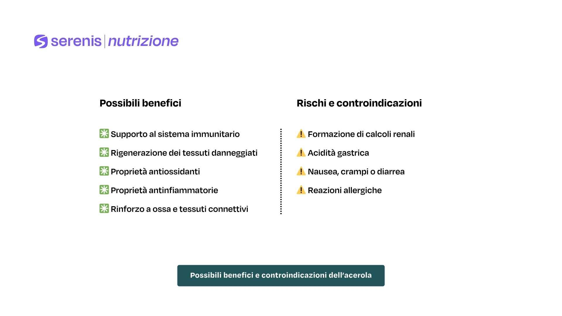 Dobbiamo poi ricordare che non esistono integratori “miracolosi” o alimenti terapeutici. I possibili benefici dati dalla vitamina C contenuti nell’acerola si possono potenzialmente ottenere solamente se colleghiamo il suo consumo ad un’alimentazione equilibrata e ad uno stile di vita sano.
