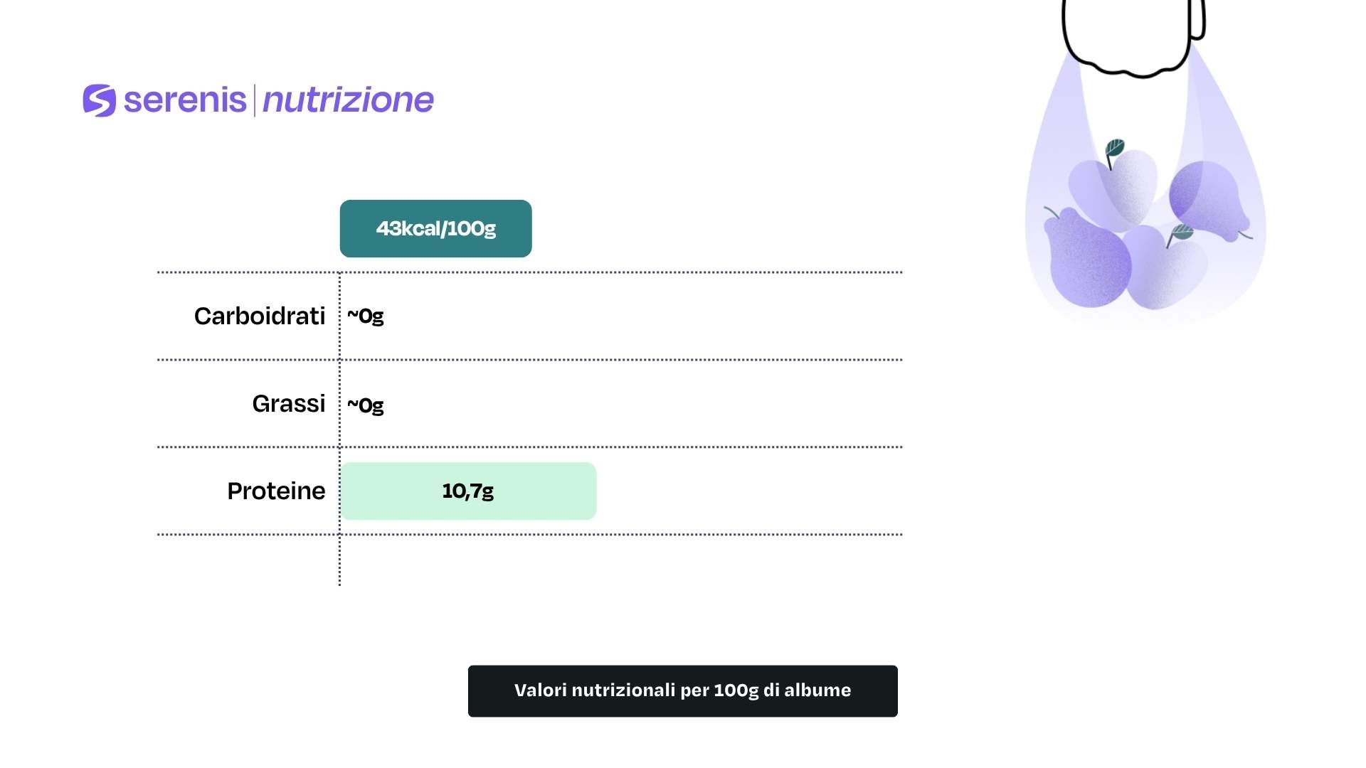 L’albume d’uovo è un alimento proteico, ricco di amminoacidi utili per la nostra salute, di minerali e di vitamine.