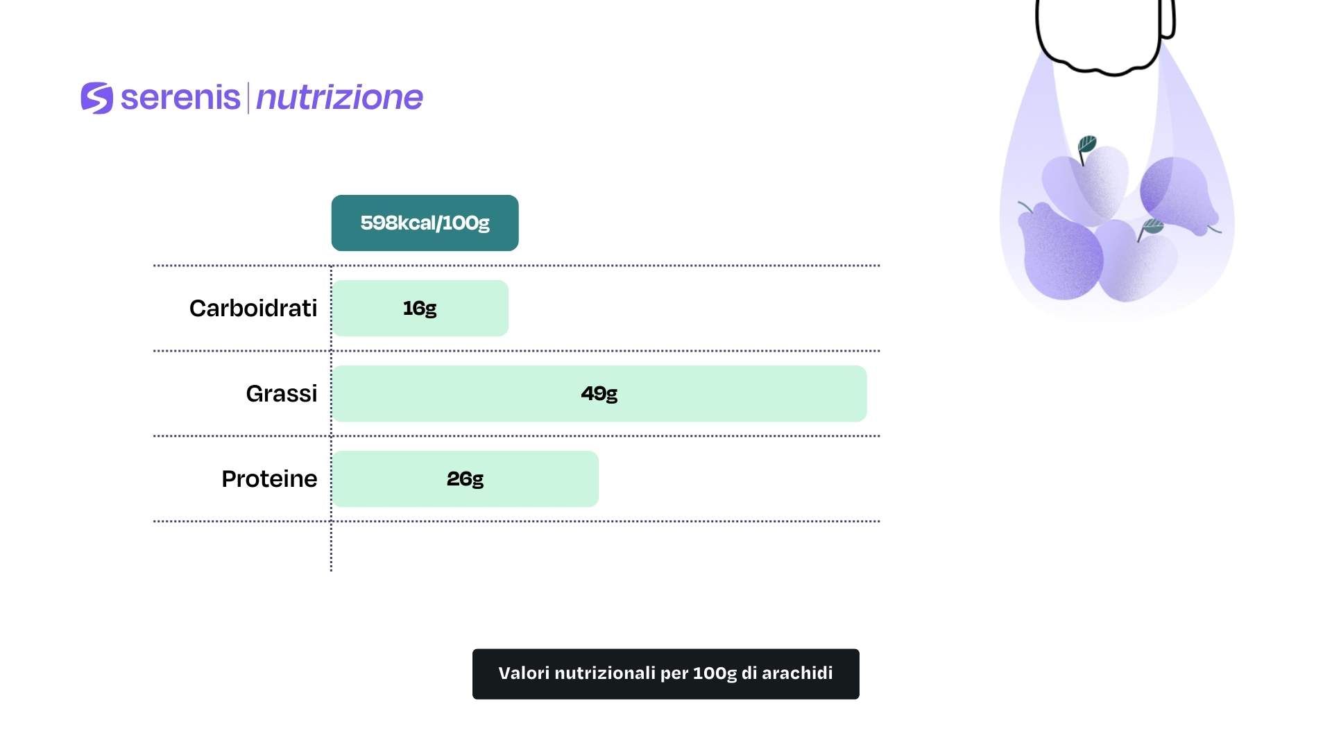 Nella tabella di seguito riportiamo i valori nutrizionali medi per 100 grammi di arachidi: