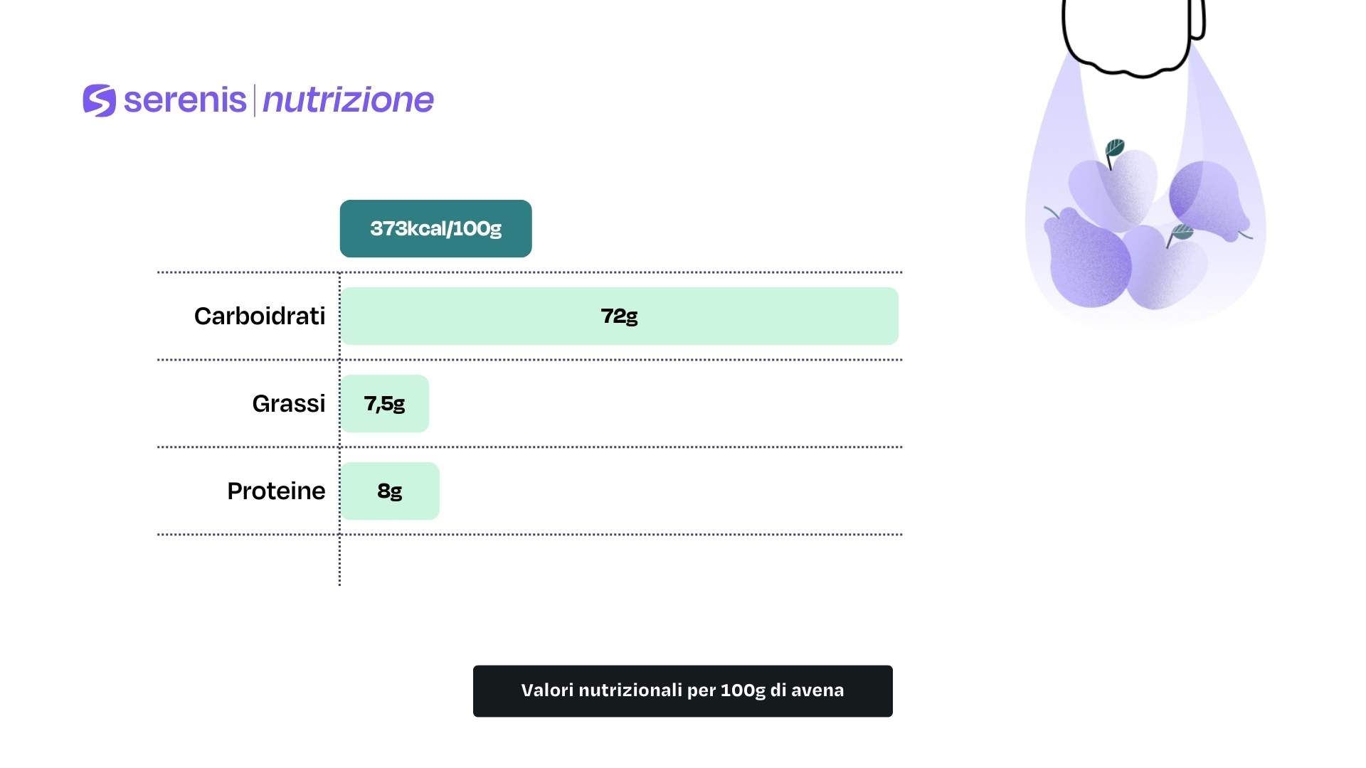 I valori nutrizionali per 100 grammi di avena sono, mediamente, pari a: