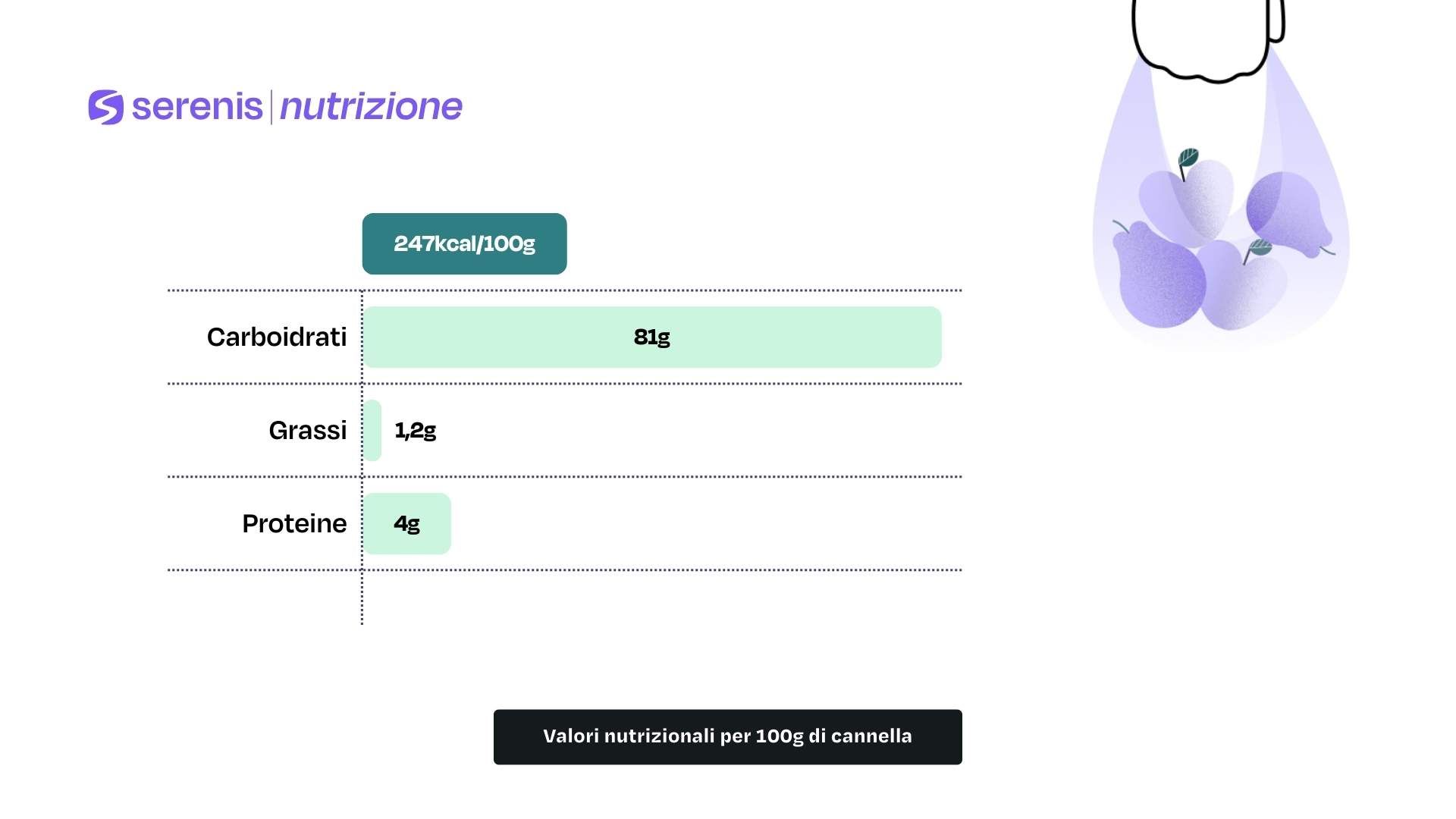 I valori nutrizionali di 100 grammi di cannella, in media, sono ripartiti come segue: