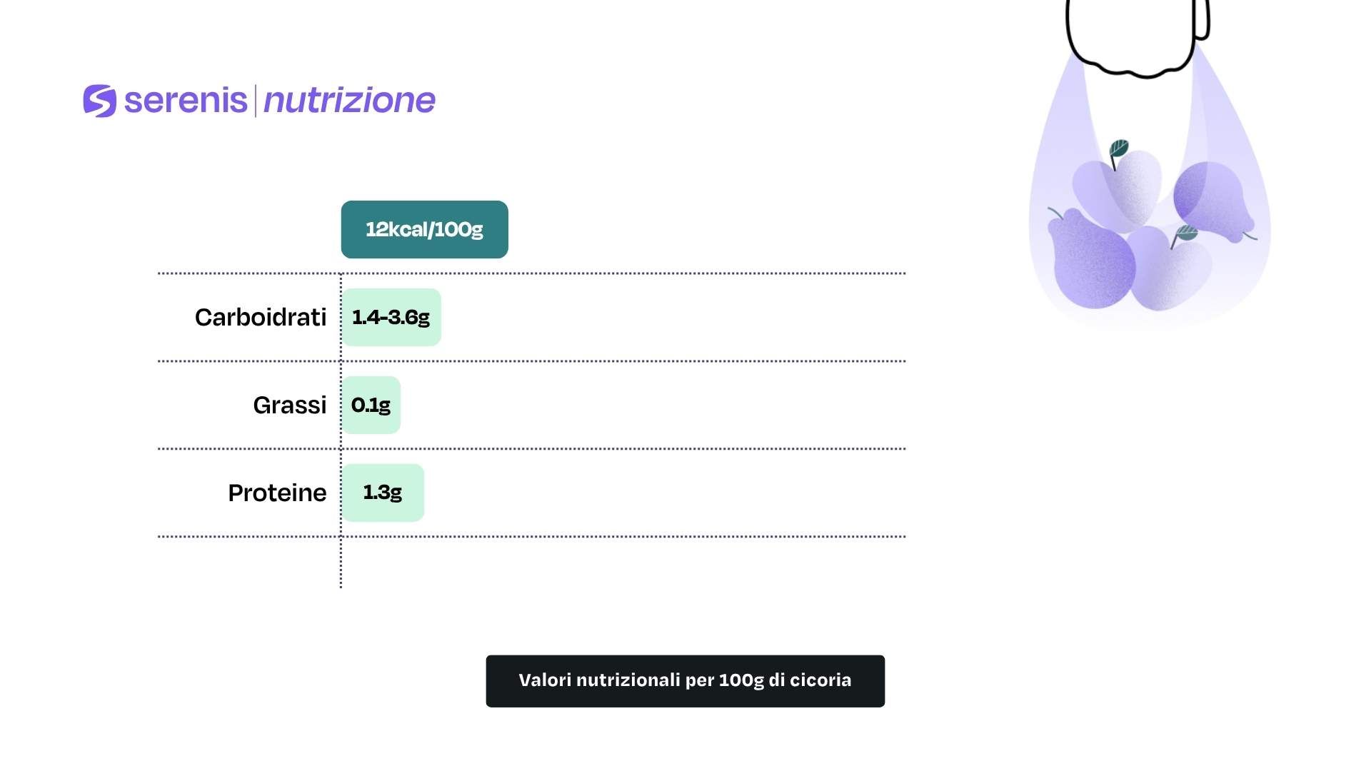 Considerando il suo bassissimo apporto calorico, la cicoria è un alimenti salutare da inserire nelle diete equilibrate o nei regimi alimentari dietetici: infatti, per 100 grammi di cicoria (solo foglie) si assumono appena 12 calorie. Basti pensare che 95 grammi su 100 sono composti da acqua e al suo interno si trovano buone dosi di potassio, calcio, vitamine K, B1, C ed E.