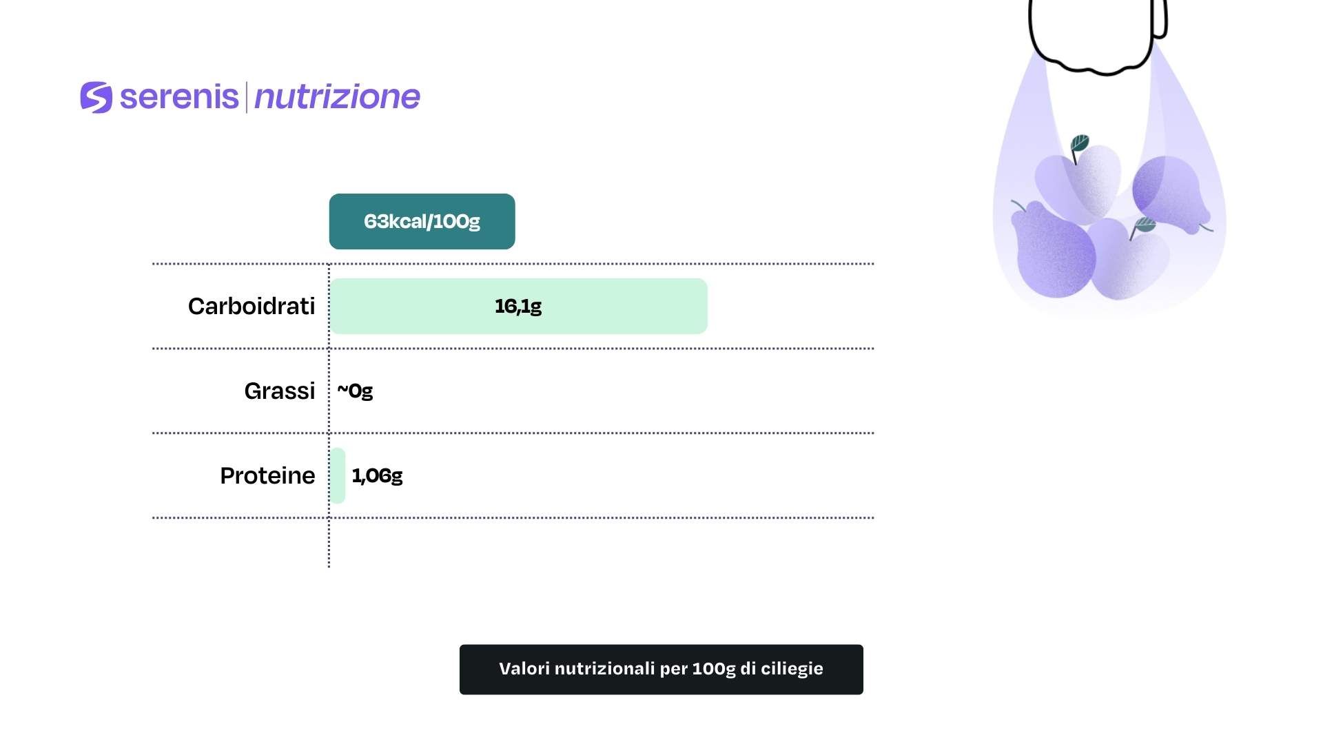 Di seguito una tabella con i valori nutrizionali medi per 100 grammi di ciliegie.