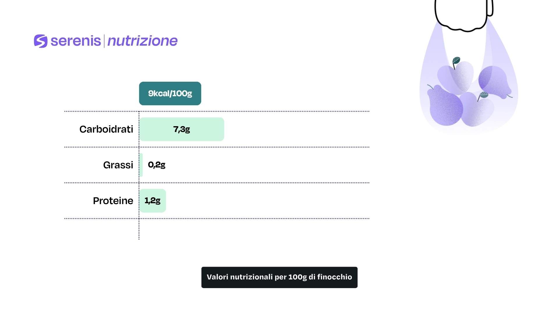 Il finocchio è una verdura a basso contenuto calorico: basti pensare che in 100 grammi di prodotto ci sono appena 9 kcal, 2,2 grammi di fibre e 1,2 grammi di proteine. Possiamo quindi considerarlo come un vero e proprio diuretico naturale, in quanto favorisce il transito intestinale e aiuta a combattere la stitichezza anche grazie alla sua ricchezza di acqua (circa il 93% del prodotto).