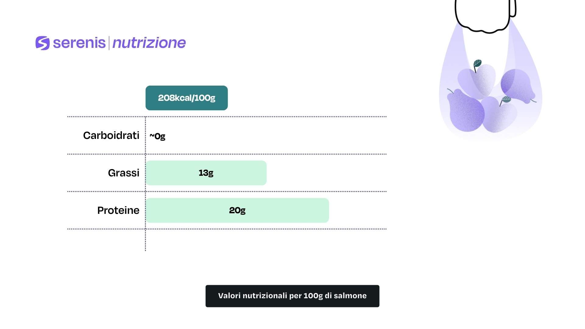 Le proprietà nutrizionali medie per 100 grammi di salmone sono suddivise come segue: