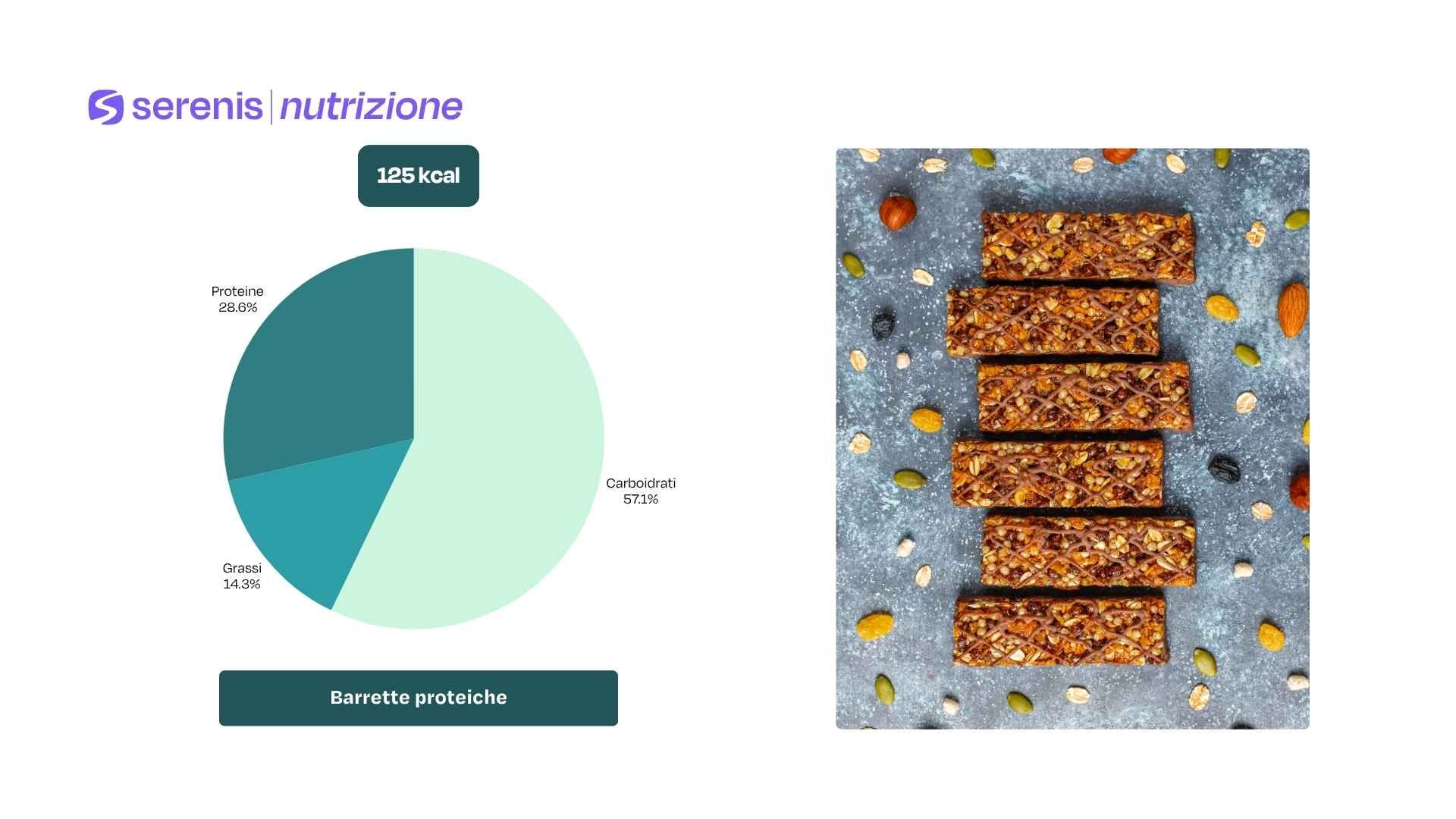Valutando una media dei valori nutrizionali delle barrette proteiche presenti in commercio, che apportano circa 414kcal ogni 100 grammi, e considerando una barretta singola dal peso di 30 grammi, possiamo ottenere uno spuntino da 8 grammi di proteine.