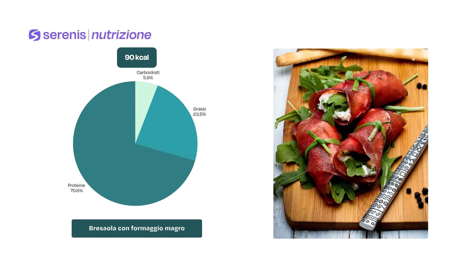 Ipotizzando di farcire 30 grammi di bresaola con 25 grammi di formaggio spalmabile light, possiamo ottenere uno spuntino con 12 grammi di proteine.
