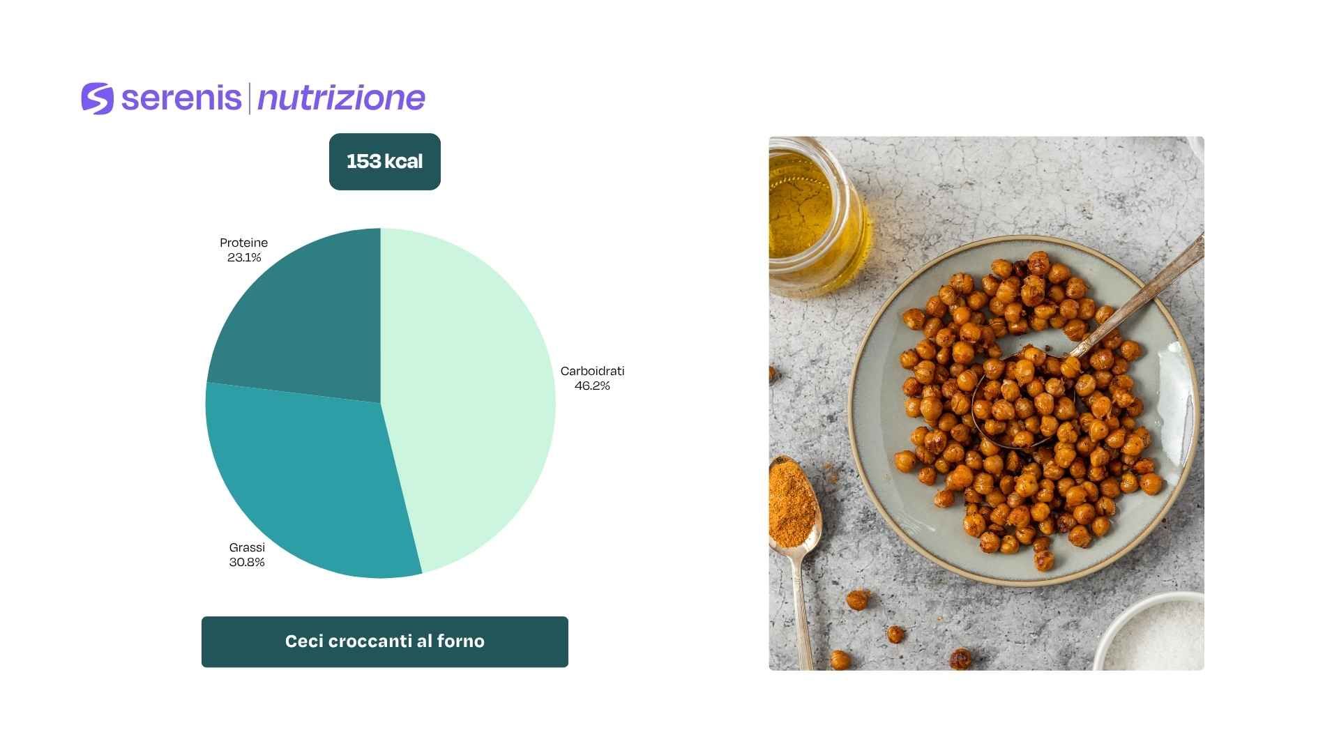 Ipotizzando di mangiare 100 grammi di ceci, conditi con un filo d'olio (ca. un cucchiaino, quindi 5 grammi) e spezie varie cotti al forno, otterremo uno spuntino con 6 grammi di proteine.