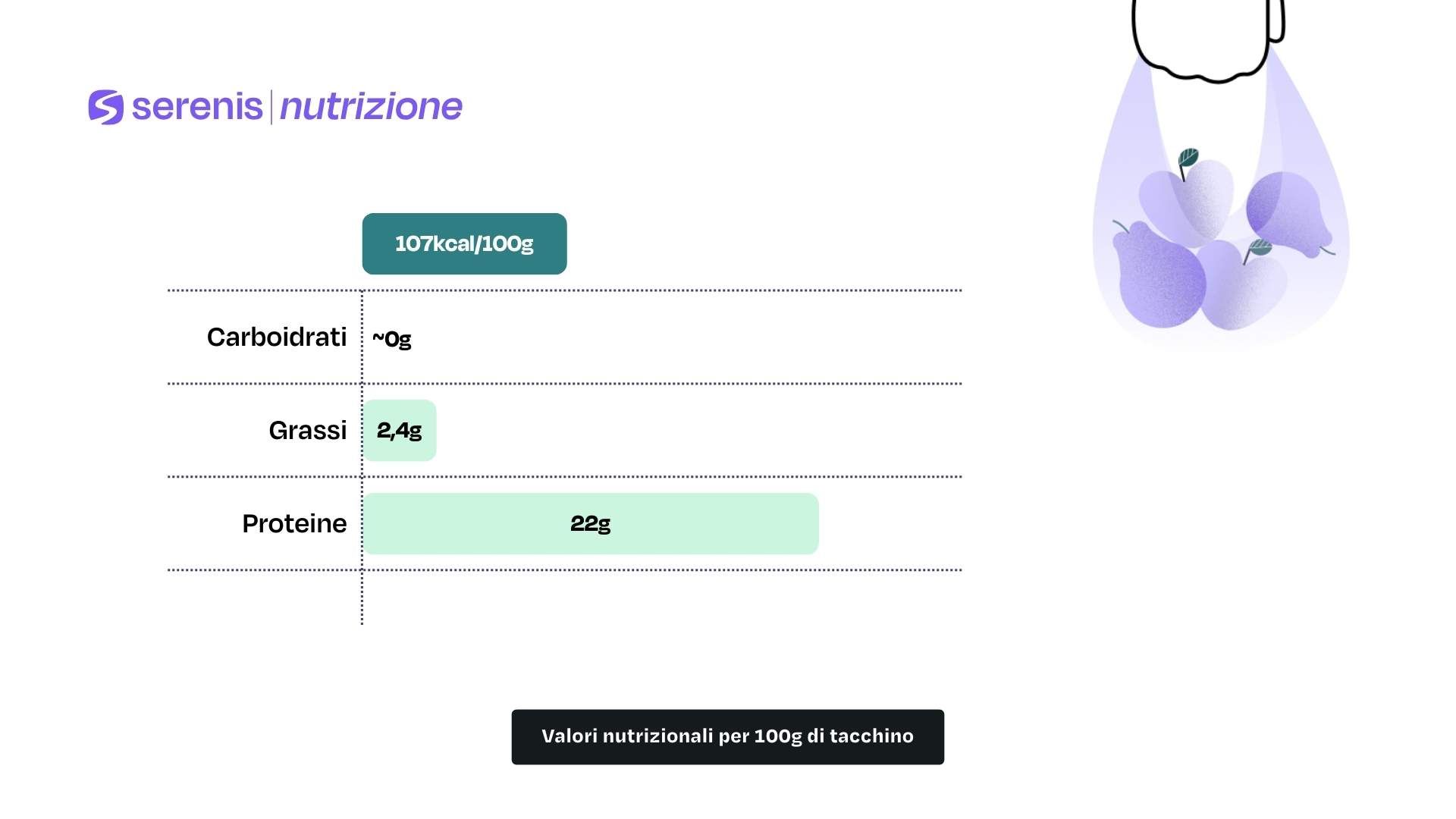 I valori nutrizionali medi di 100 grammi di petto di tacchino privato della pelle sono distribuiti come segue:
