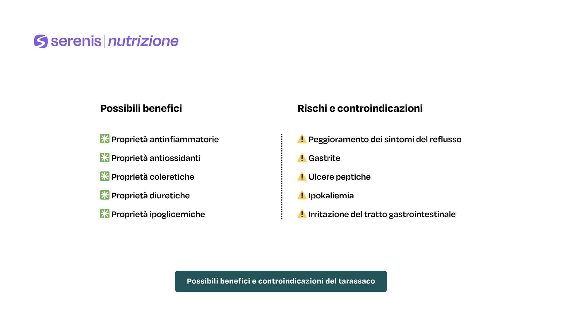 È importante tenere presente che questi potenziali effetti benefici sono, appunto, potenziali e non ancora confermati in via definitiva da studi scientifici. L'integrazione del tarassaco nella dieta può essere, dunque, potenzialmente utile, ma non va in alcun modo a sostituire un'alimentazione equilibrata stilata da un nutrizionista o uno stile di vita sano.