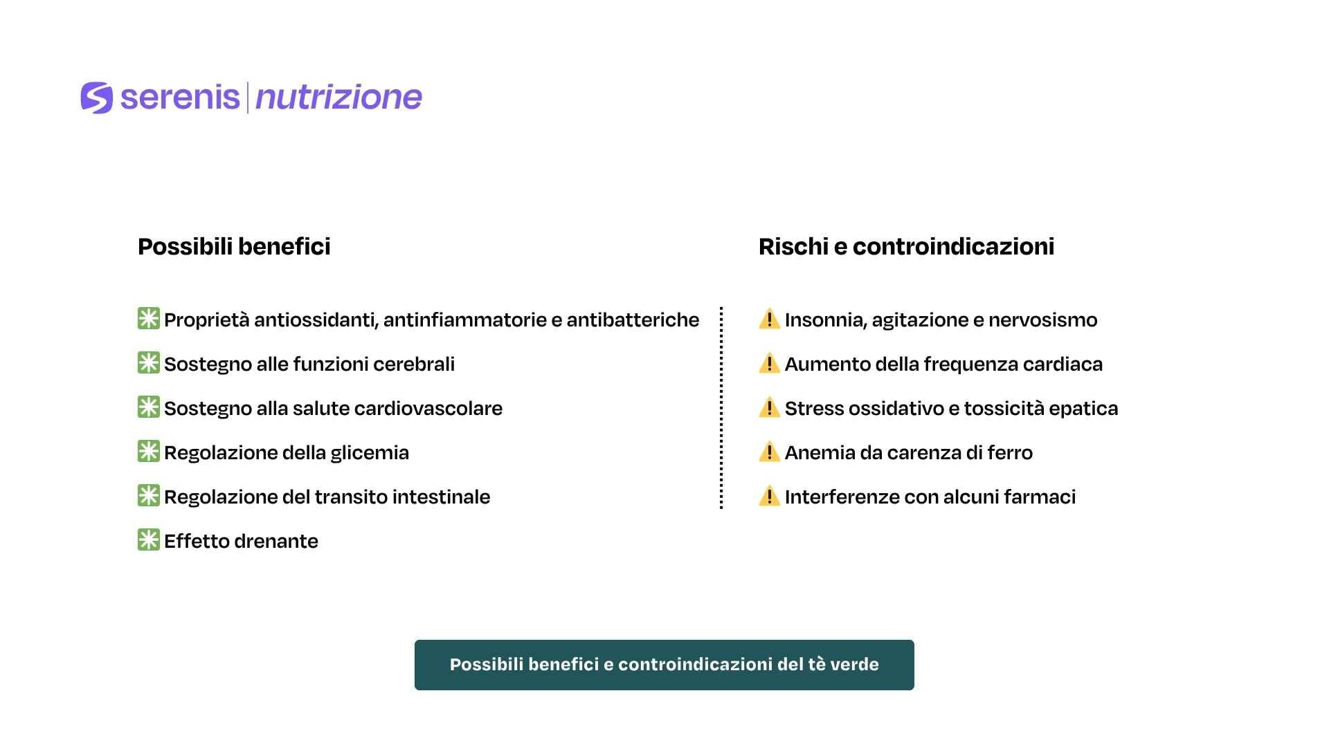 - I tannini contenuti nel tè verde possono potenzialmente ridurre l’assorbimento del ferro non-eme, ovvero il ferro di origine vegetale. Andrebbe quindi assunto lontano dai pasti, e il suo consumo andrebbe limitato, in soggetti con anemia da carenza di ferro.