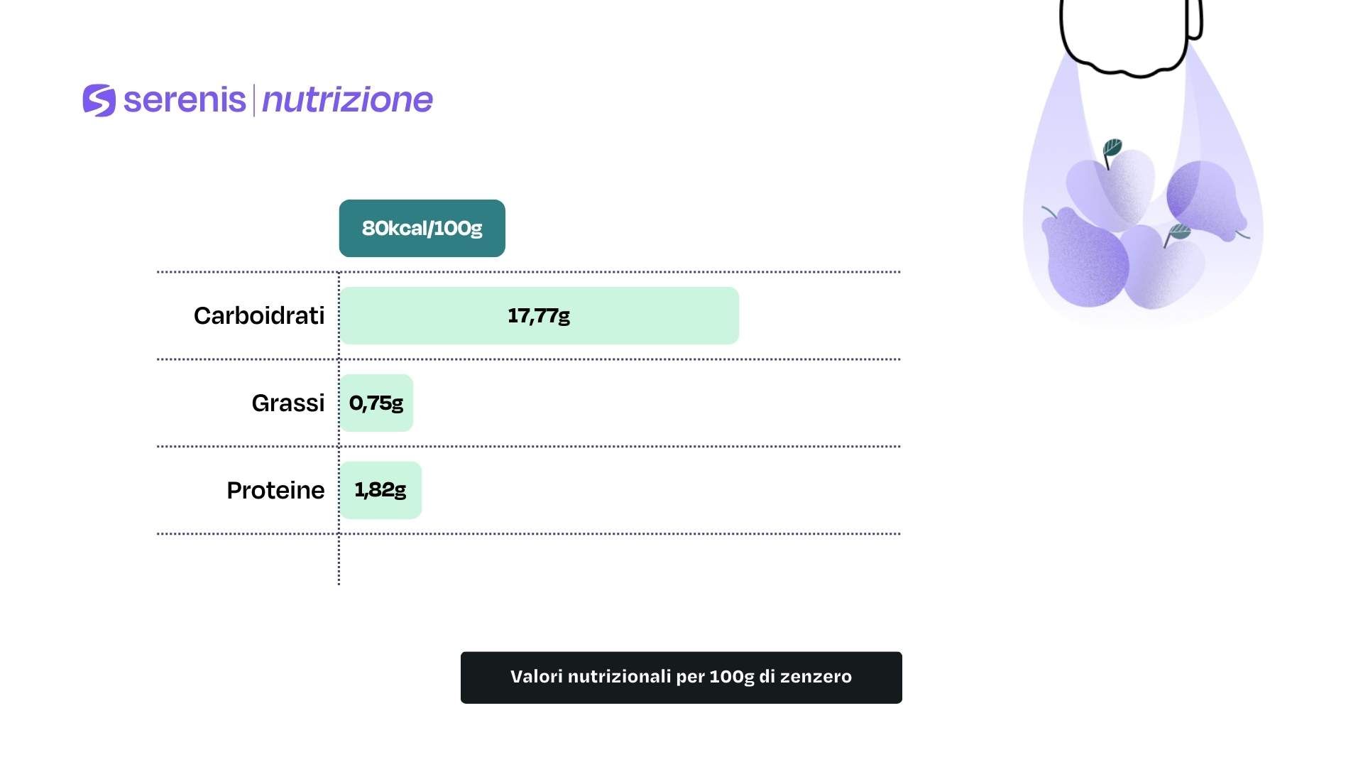 In tabella i valori nutrizionali medi contenuti in 100 grammi di zenzero.