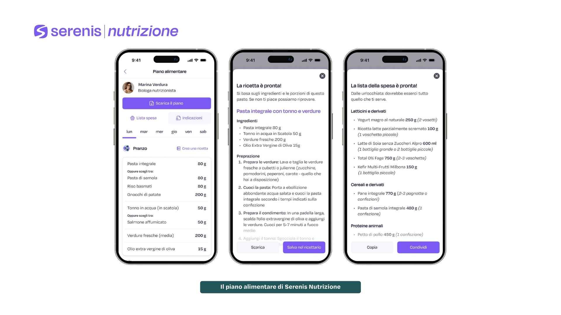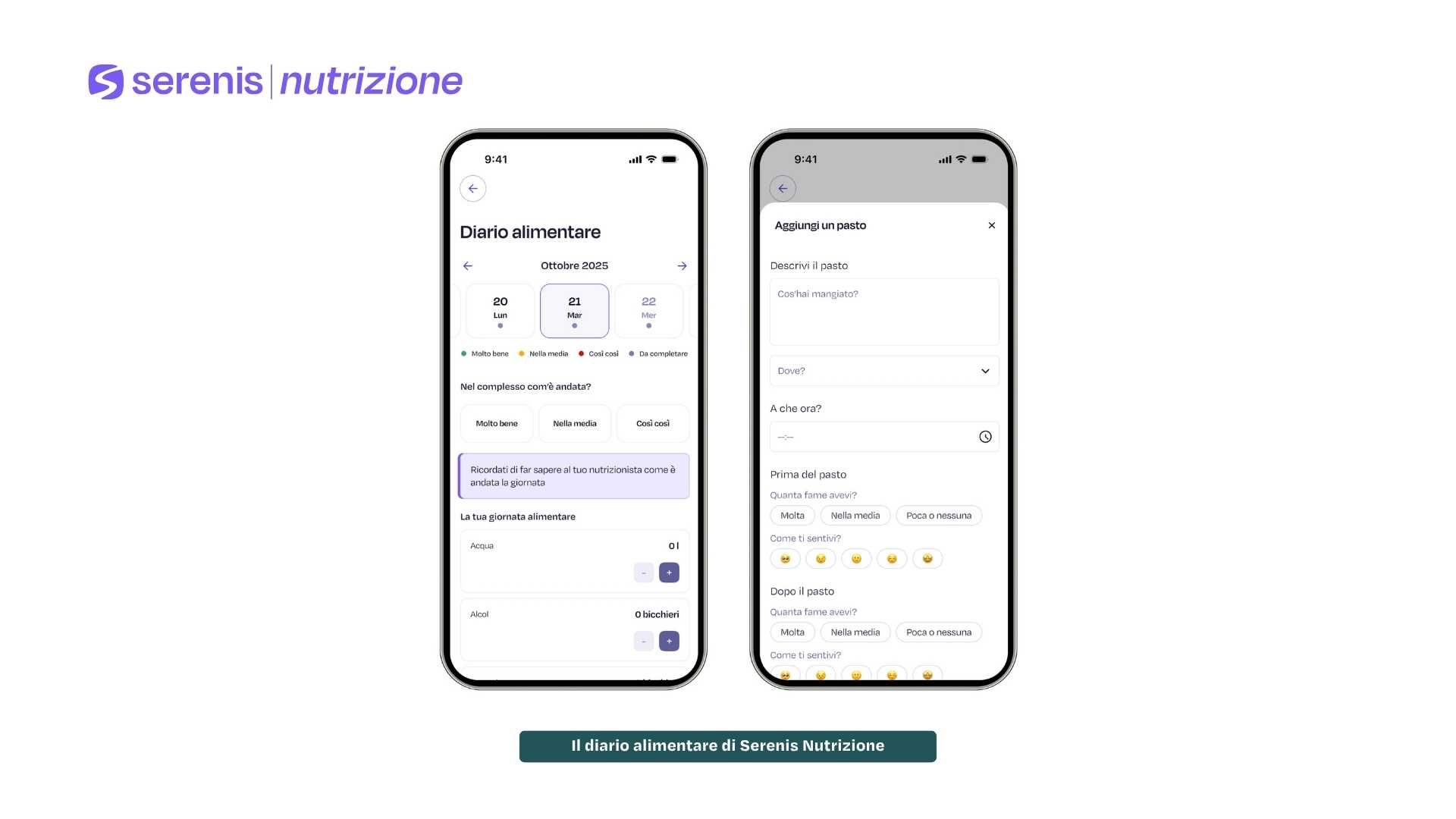 Due aspetti particolarmente interessanti dell'applicazione di Serenis Nutrizione sono il diario alimentare e il piano alimentare.