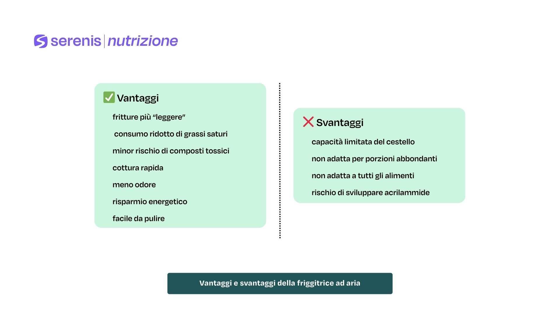 - Svantaggi della friggitrice ad aria: non rende sani gli alimenti poco salutari. Il cestello è piccolo, quindi poco adatto per grandi porzioni. Se usata male, può generare sostanze dannose e cotture irregolari. Non sostituisce una dieta bilanciata.