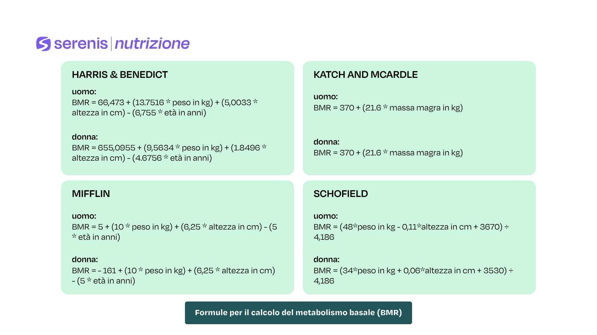 - Harris & Benedict: BMR = 655,0955 + (9,5634 * peso in kg) + (1.8496 * altezza in cm) - (4.6756 * età in anni)