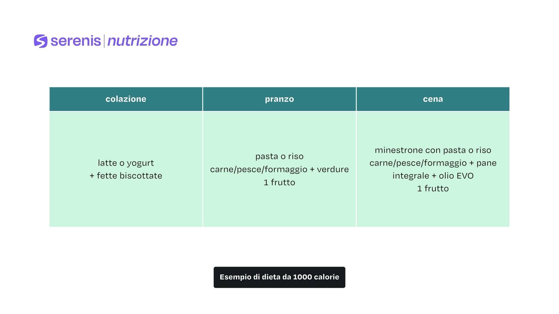 Anche se questo menù può sembrare nutriente e bilanciato, è essenziale ricordare che ogni persona ha esigenze diverse. La riduzione calorica dovrebbe sempre essere adattata alle necessità individuali, tenendo conto del proprio stile di vita, livello di attività e salute generale. Per questo motivo non è consigliabile seguire una dieta da 1000 calorie senza la supervisione di un nutrizionista.