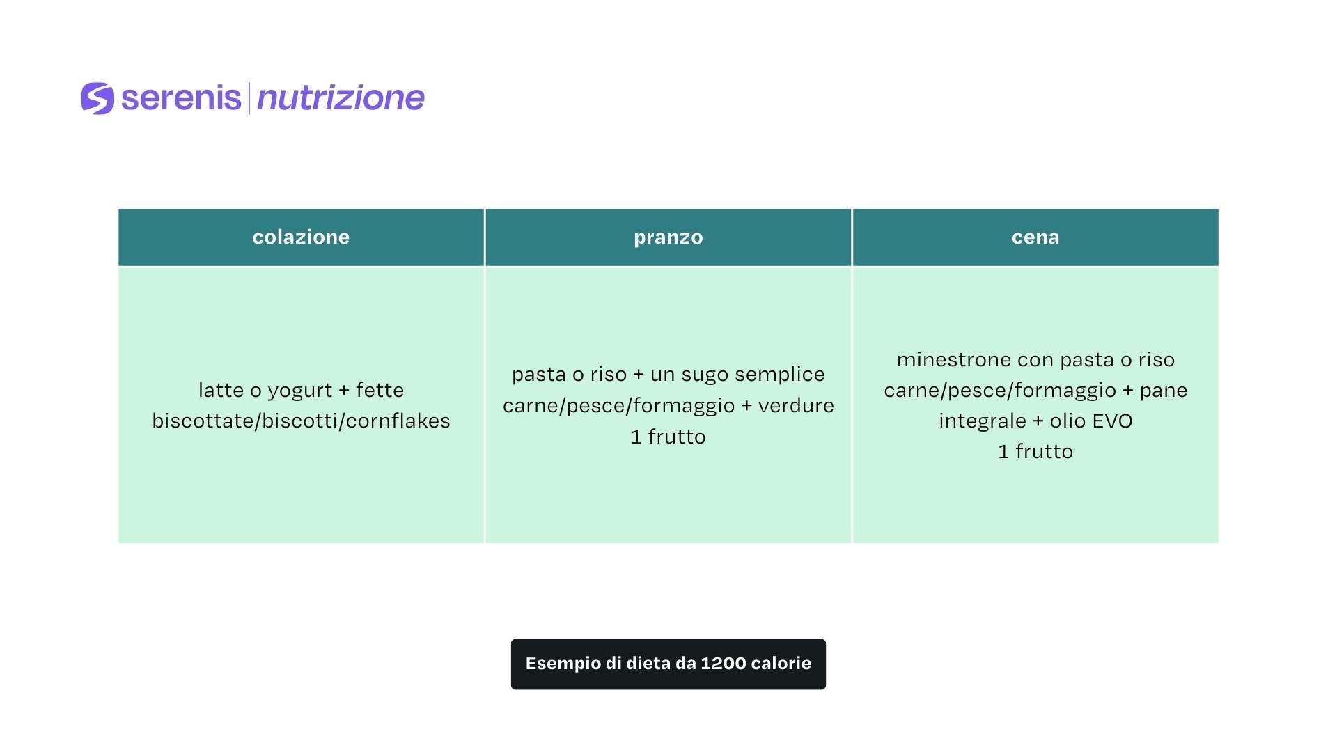 - Dieta da 1200 kcal: la dieta da 1200 calorie crea un deficit energetico, spingendo il corpo a usare le riserve di grasso. È indicata per adulti sedentari e donne in menopausa, ma va sempre personalizzata da un professionista.