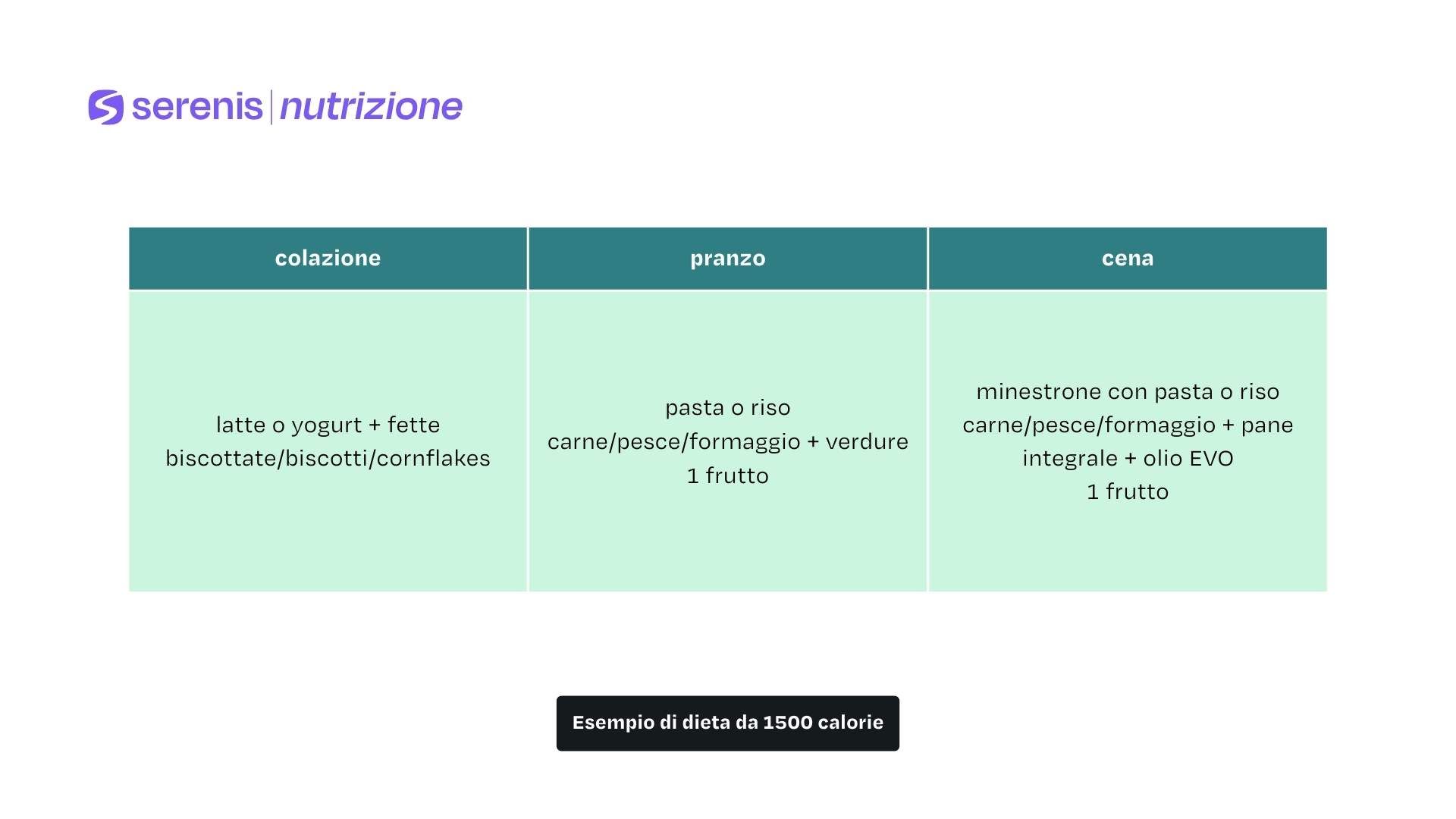 - Cosa mangiare in una dieta da 1500 calorie: una dieta da 1500 calorie bilanciata deve prevedere l'inclusione di tutti i gruppi alimentari per garantire la completezza nutrizionale. Il piano può includere latte o yogurt magro, pasta o riso integrale e una fonte proteica a pranzo e cena, come carne magra, pesce o legumi. Spesso si consiglia l'olio extravergine d'oliva come condimento principale.