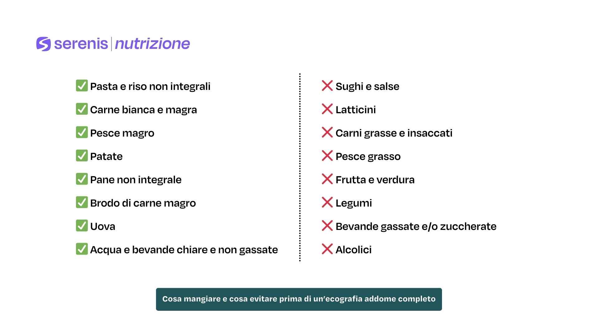 Vediamo più nel dettaglio cosa mangiare e cosa non mangiare nella dieta in preparazione all’ecografia addominale.