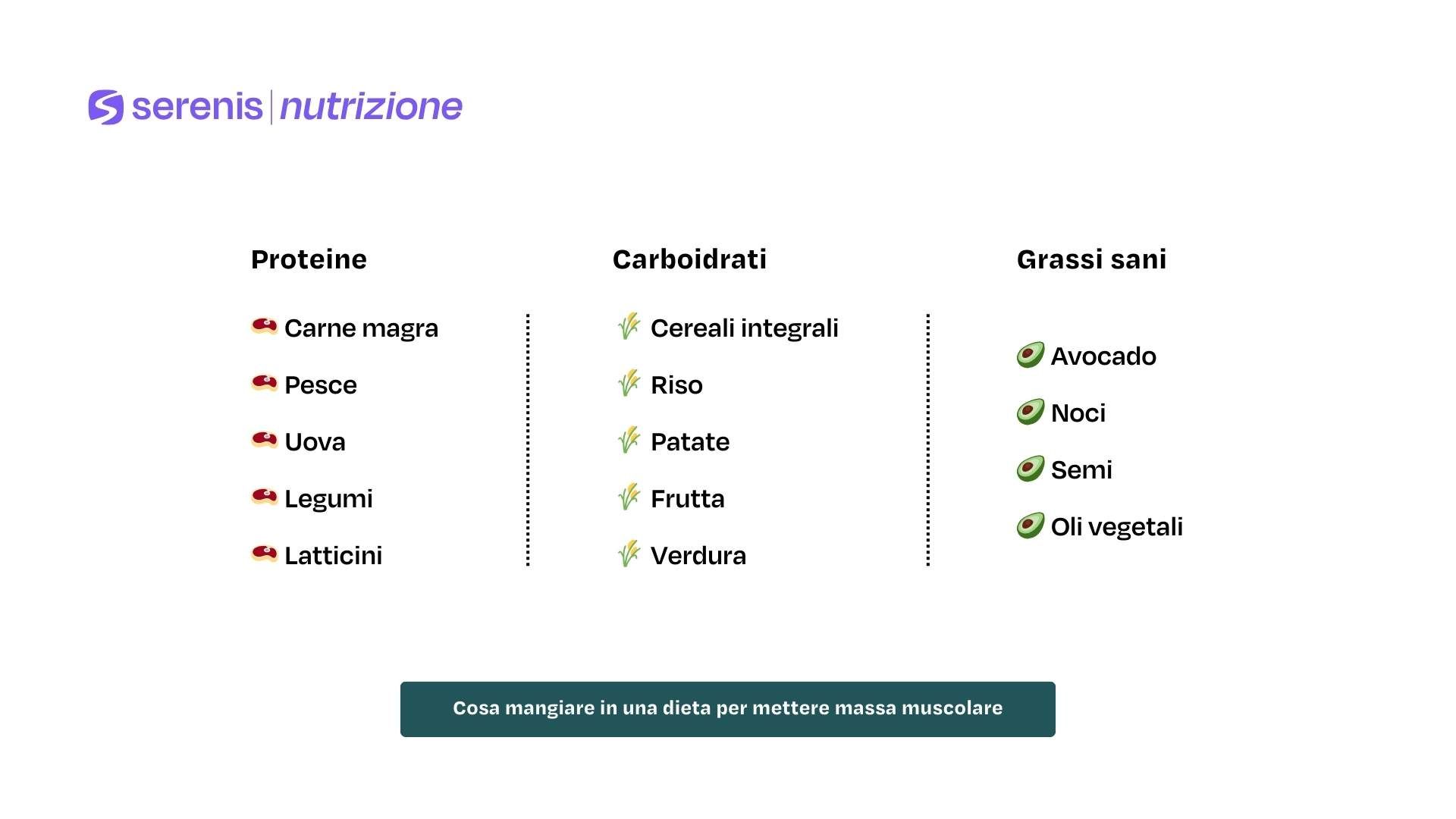 | Pranzo e cena | a pranzo e cena, includi una fonte proteica di alta qualità (carne magra, pesce o legumi), carboidrati complessi (riso integrale, pasta integrale, patate) e abbondanti verdure, che forniscono fibre e micronutrienti. L'equilibrio tra proteine, carboidrati e grassi è cruciale per promuovere la crescita muscolare senza accumulare grasso corporeo. |