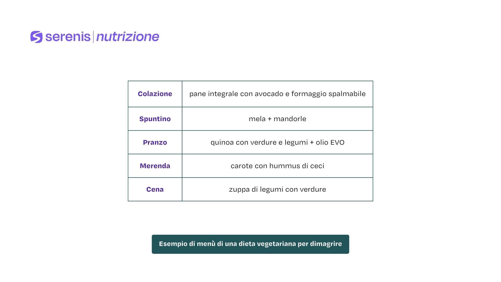 Di seguito, proponiamo un esempio giornaliero puramente informativo di dieta vegetariana ipocalorica, pensato per offrire un apporto bilanciato di nutrienti: