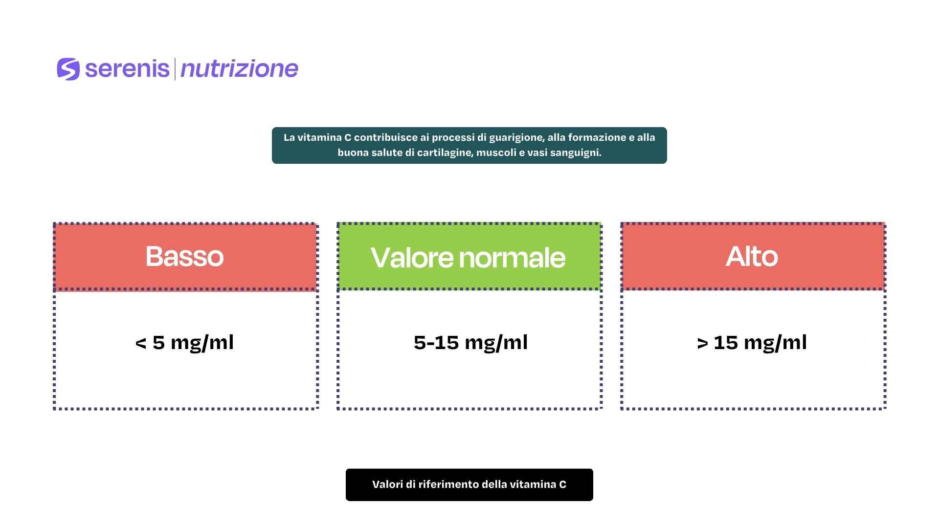 I valori dell'esame della vitamina C possono variare a seconda del laboratorio ma, in generale, il valore ideale di vitamina C si colloca tra i 5 e i 15 mg/ml.