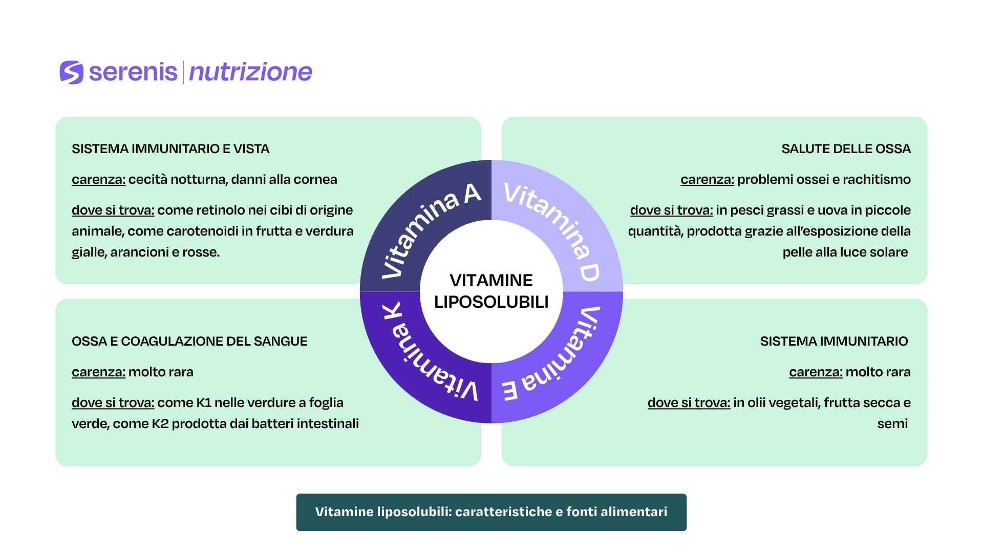 Le vitamine liposolubili, come accennato, si sciolgono nei grassi e tendono a venire immagazzinate nell’organismo. Le principali vitamine liposolubili includono: