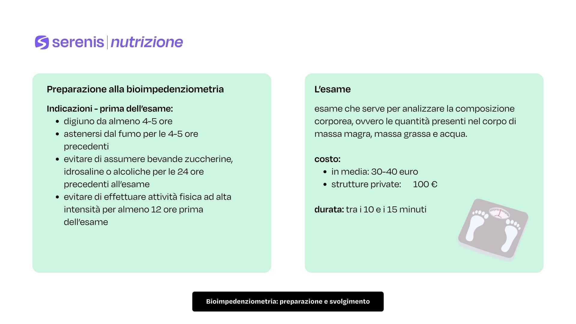 - Cos'è la bioimpedenziometria: è un esame rapido, economico e non invasivo che misura la composizione corporea (massa grassa, massa magra e acqua). Si basa sul passaggio di una lieve corrente elettrica attraverso i tessuti corporei.