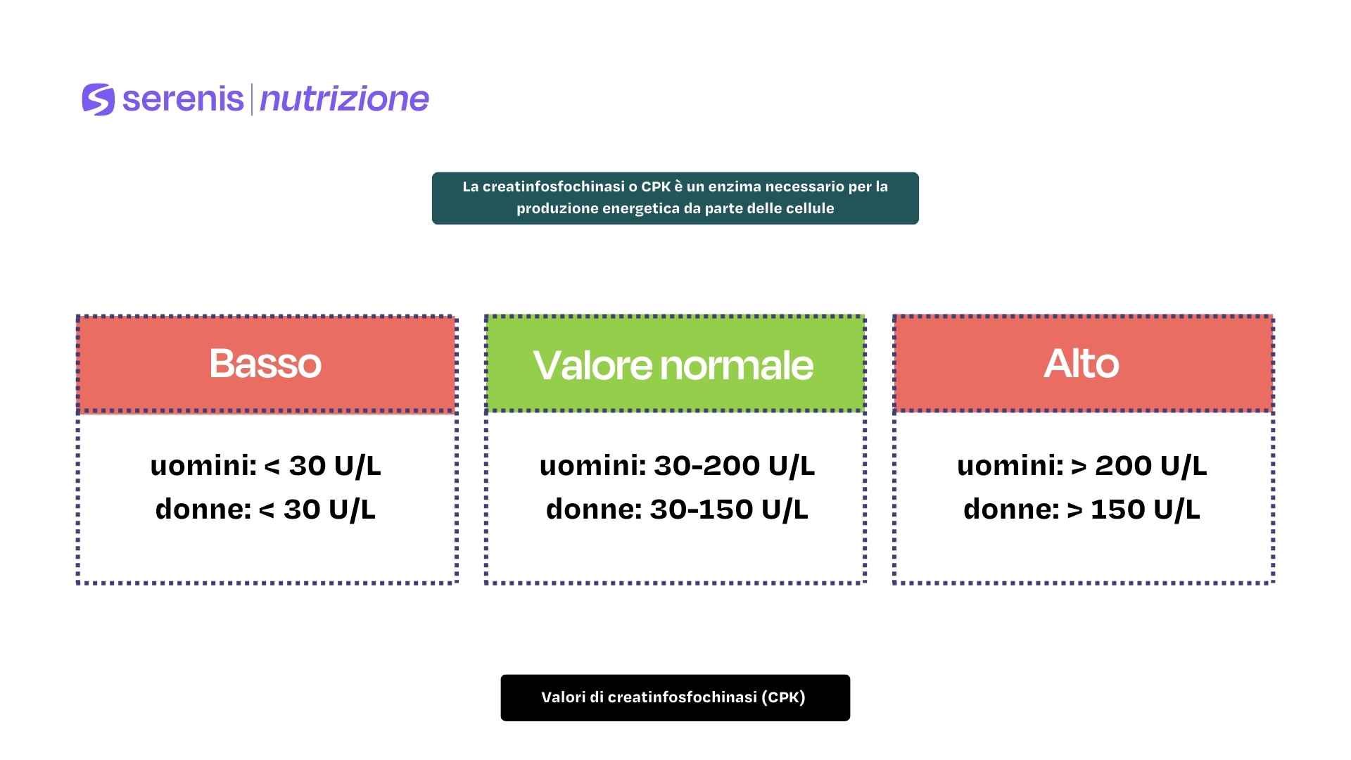 - CPK alto: valori alti di CPK possono indicare lesioni muscolari, infarto, ipotiroidismo o malattie neuromuscolari. Anche l’esercizio intenso può aumentare il valore. È importante rivolgersi al medico se compaiono sintomi come dolori muscolari, urine scure o stanchezza persistente.