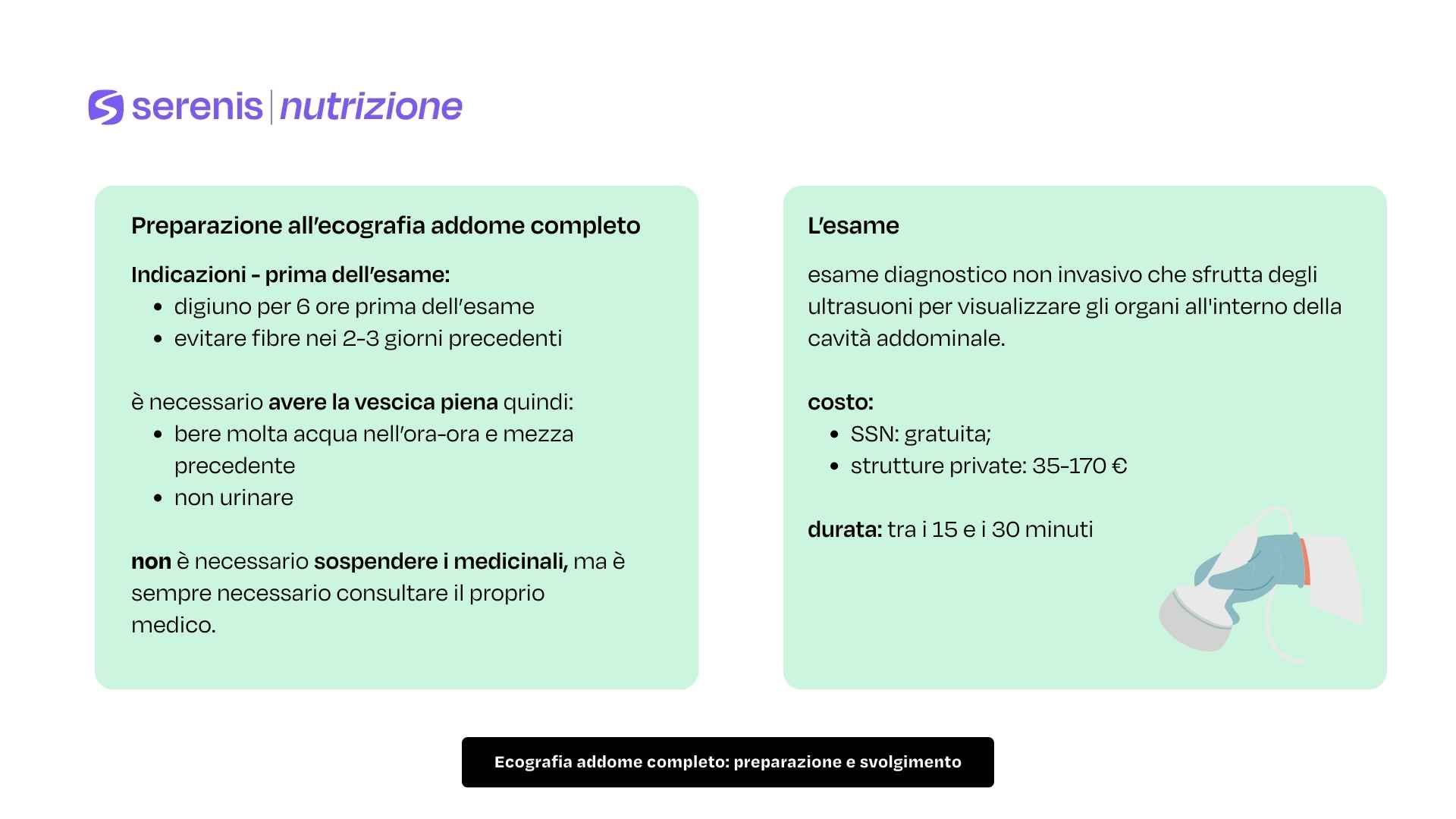 Per un'ecografia addominale completa, è fondamentale avere la vescica piena per visualizzare correttamente gli organi pelvici (vescica, utero, ovaie, prostata).