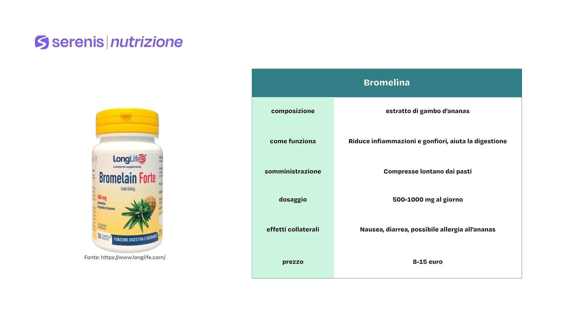 - Cos’è la bromelina: la bromelina è un enzima estratto dal gambo e dal succo dell’ananas. Ha proprietà antinfiammatorie, digestive e, secondo alcuni studi, potrebbe aiutare a contrastare dolore, gonfiore e infiammazioni.