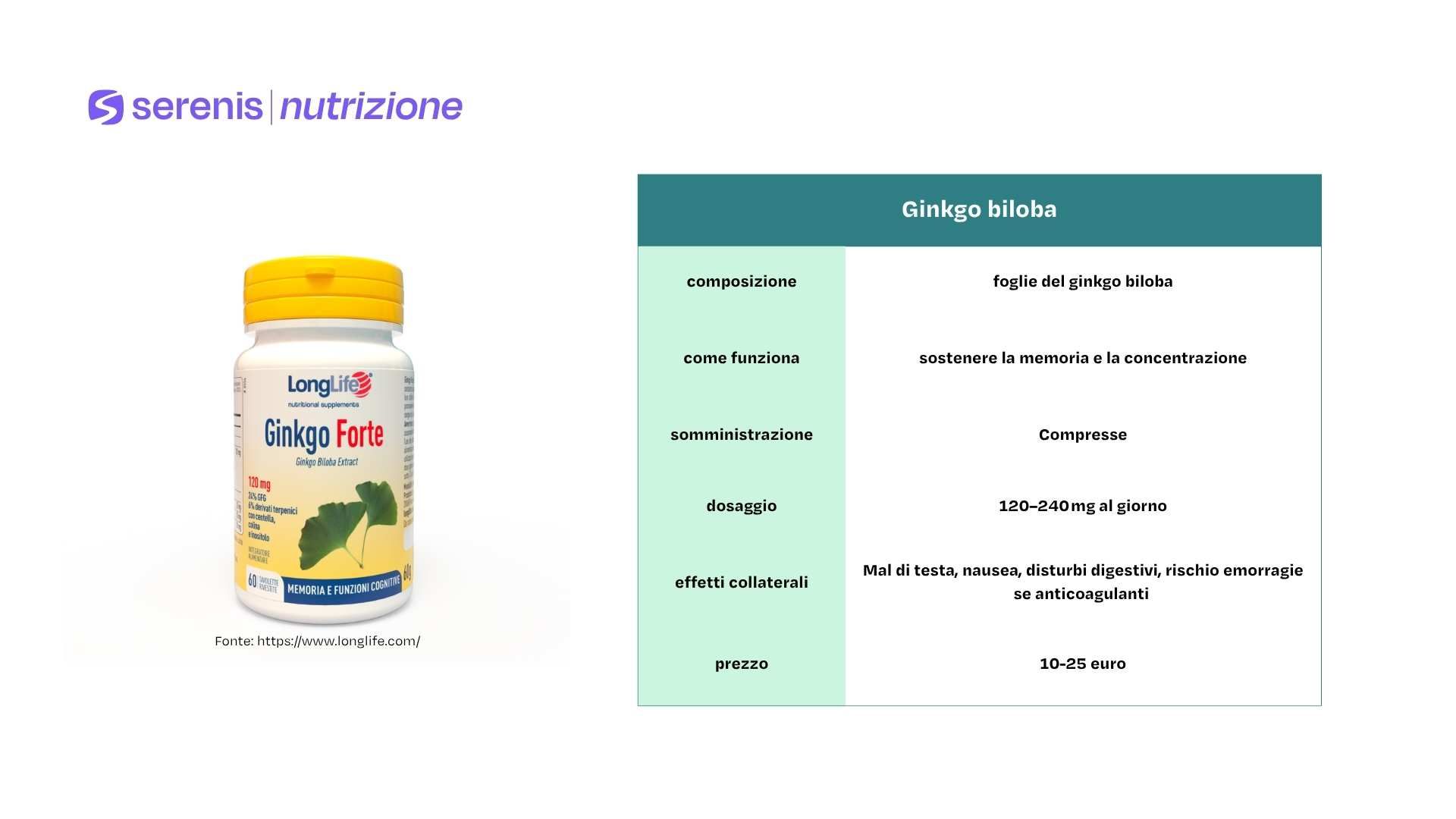 Gli integratori di ginkgo biloba promettono diversi benefici, e verrebbero impiegati in particolare per sostenere la memoria e la concentrazione. L’effetto potenziale sarebbe effettivamente legato all’aumento del flusso sanguigno a livello cerebrale, che a sua volta migliorerebbe l’apporto di ossigeno e nutrienti. Per questo motivo possiamo trovarlo come ingrediente principale o secondario all’interno di numerosi integratori per anziani.