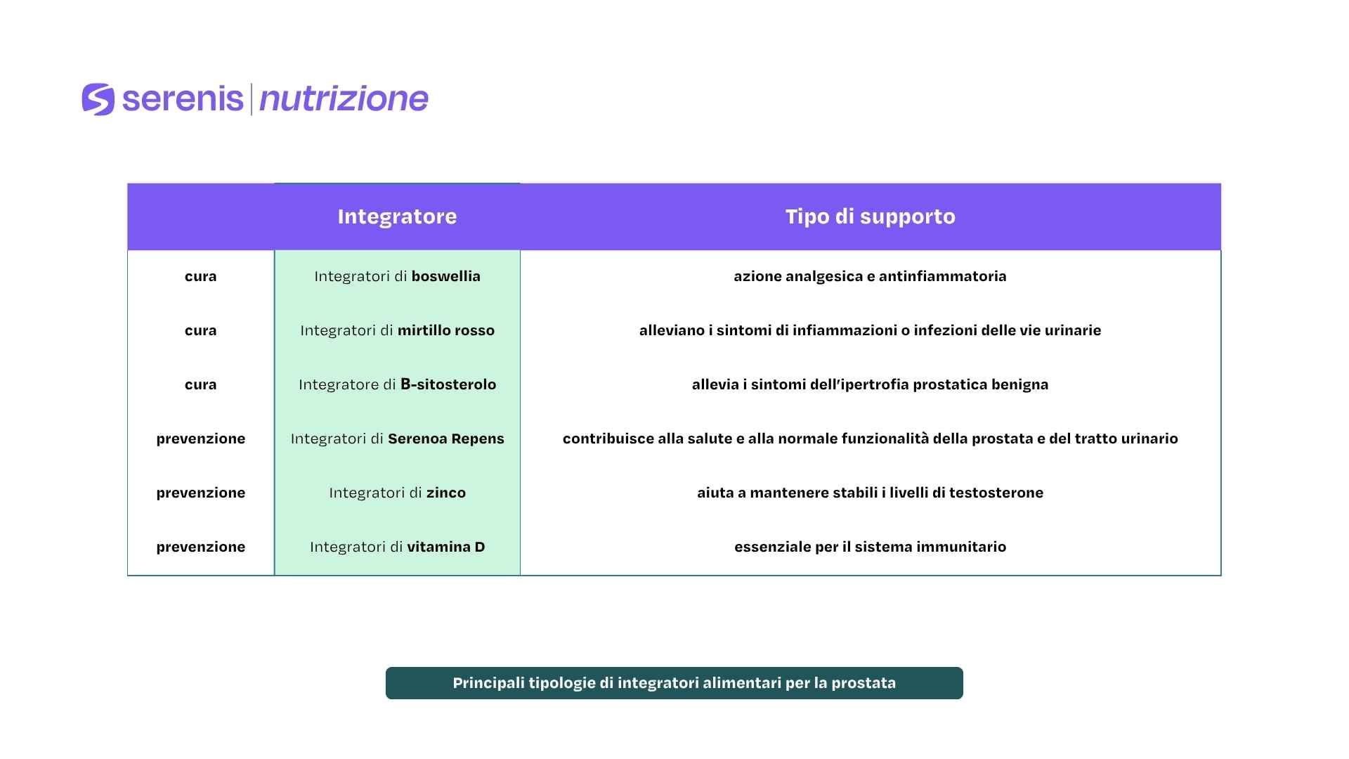 - Integratori di Serenoa Repens. La Serenoa Repens tende a contribuire alla salute e alla normale funzionalità della prostata e del tratto urinario, prevenendo le infiammazioni;