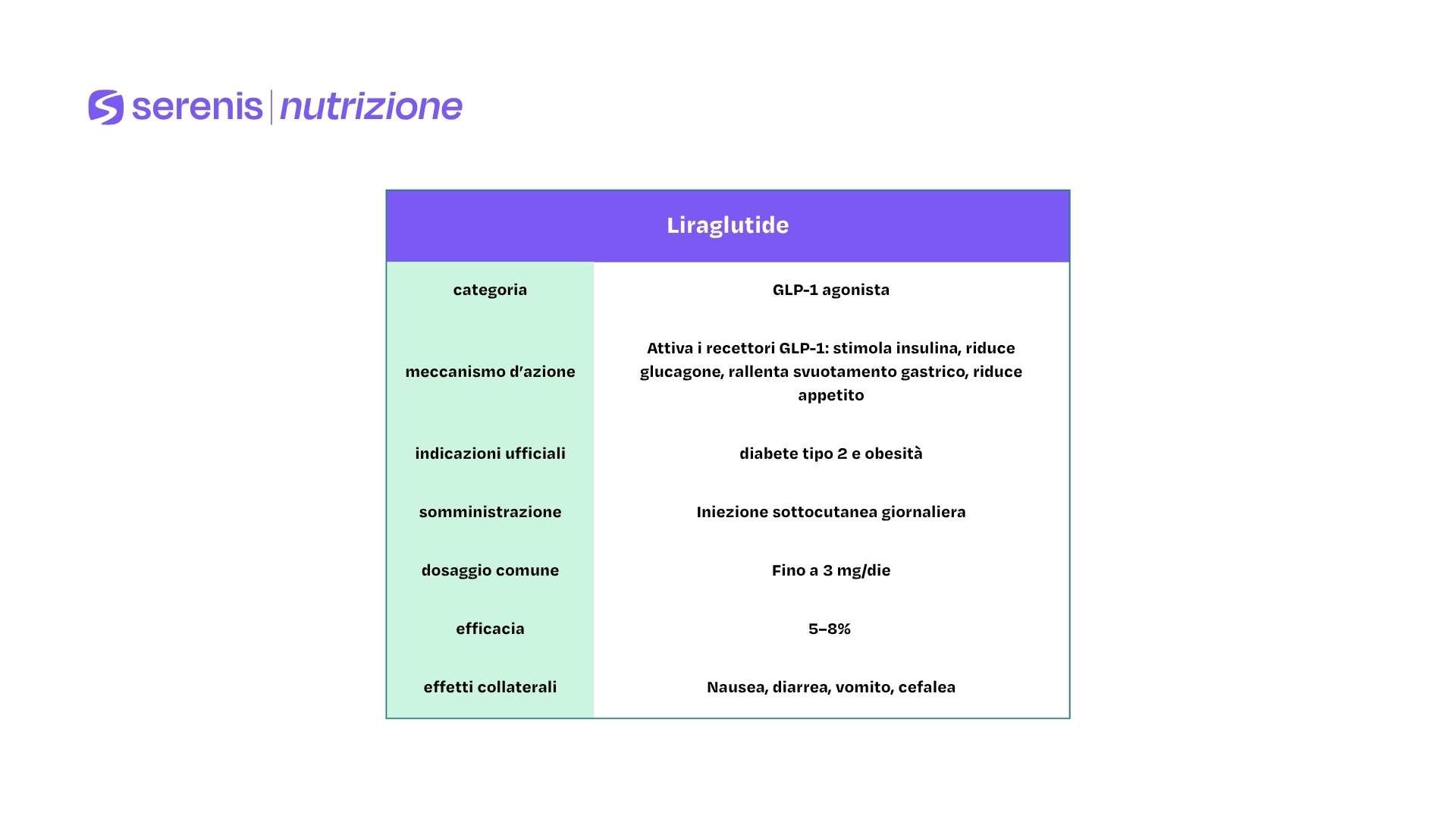 La liraglutide è un agonista del recettore GLP-1 (glucagon-like peptide-1) approvato per la regolazione della glicemia nel diabete di tipo 2 e, con un marchio distinto e dosaggio maggiore, per la gestione dell’obesità/sovrappeso con comorbidità.
