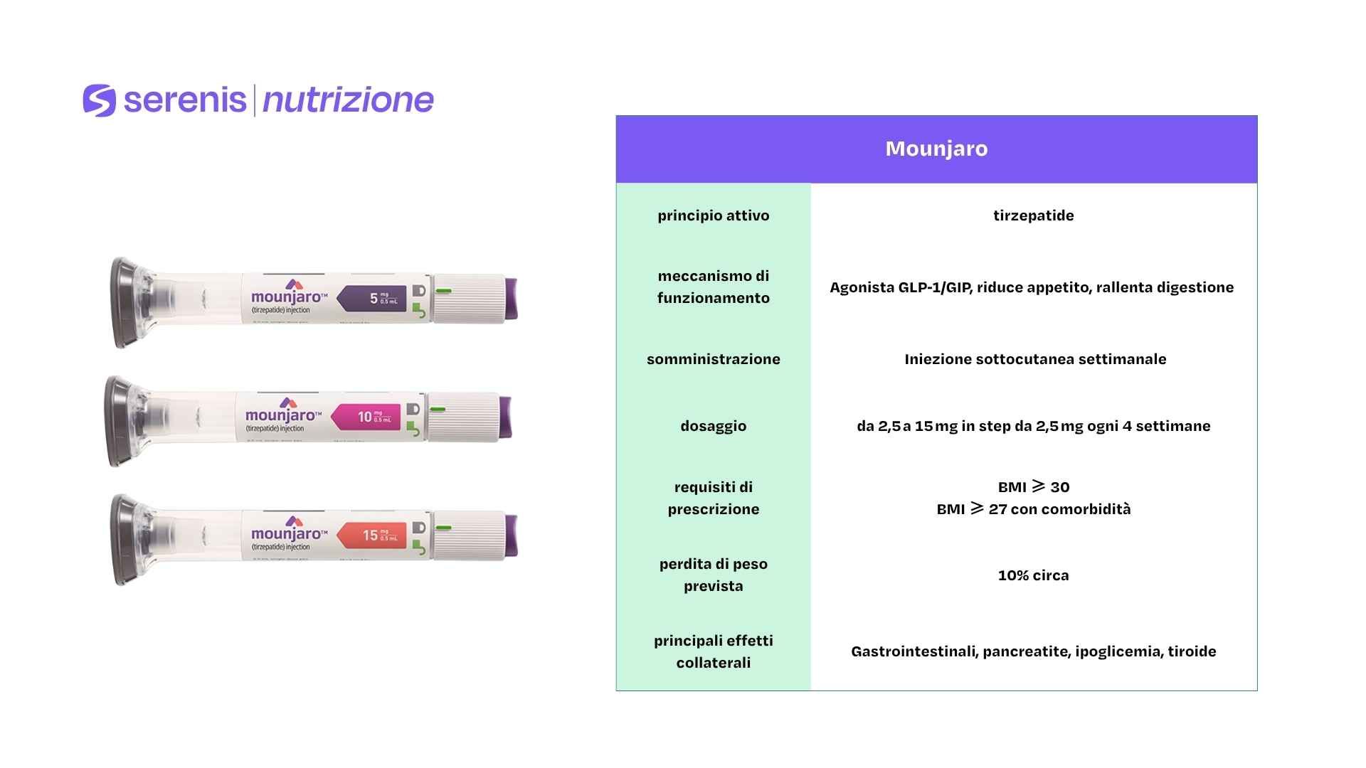 Contiene tirzepatide, una molecola che agisce su due recettori ormonali, ovvero GIP e GLP-1: questa doppia azione aiuta ad aumentare il senso di sazietà e ridurre la sensazione di fame, aumentare la lipolisi e migliorare una serie di parametri cardio-metabolici.