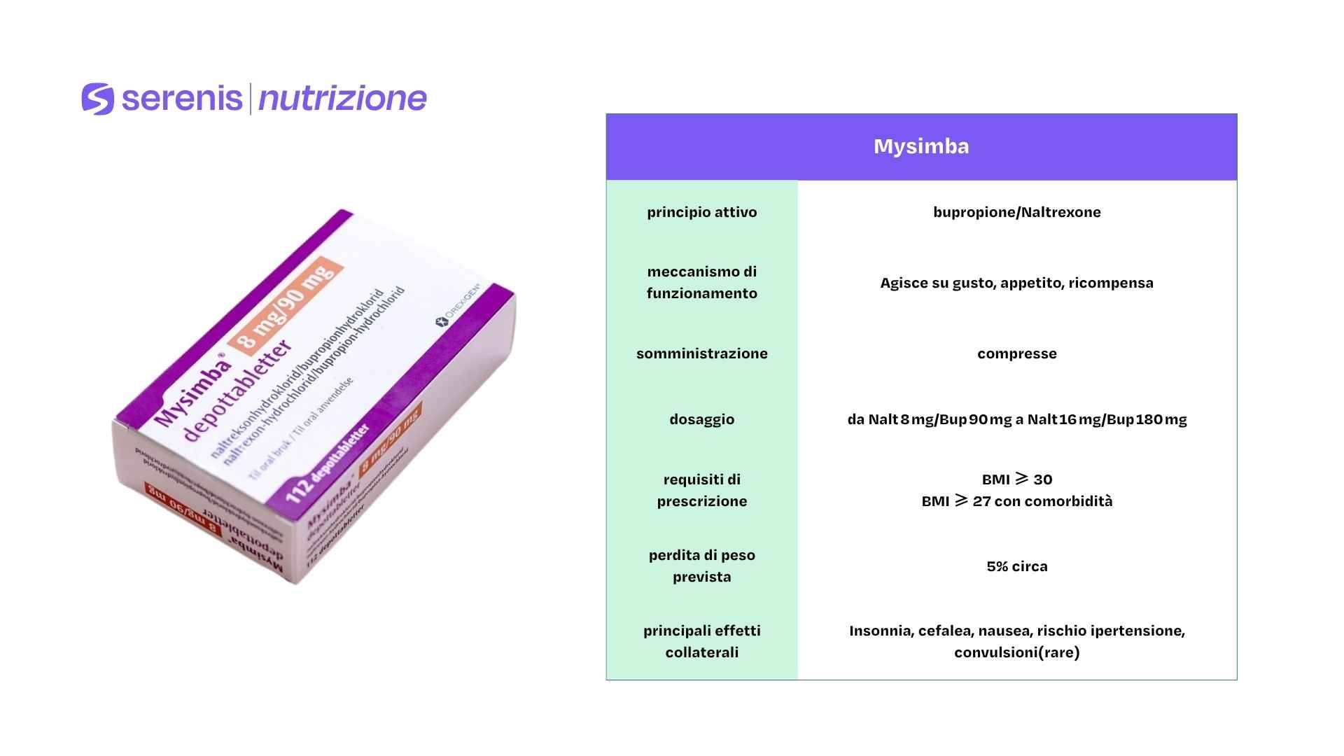 Mysimba è un medicinale orale a rilascio prolungato che combina i principi attivi naltrexone e bupropione e che viene utilizzato per la gestione del peso in adulti con obesità o sovrappeso con comorbidità.