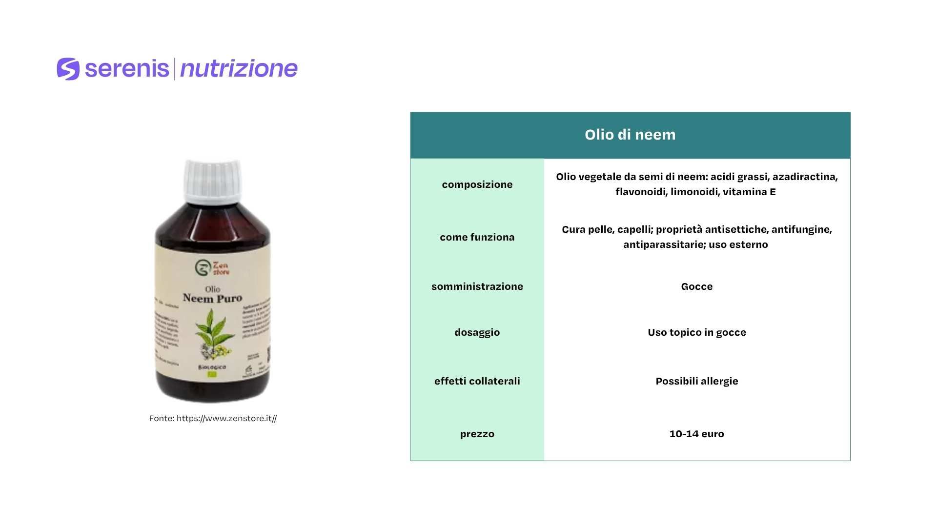 L’olio di neem è un olio vegetale usato su pelle, capelli, piante e animali per le sue proprietà idratanti, emollienti, antimicotiche e antiparassitarie. È noto per i suoi molteplici usi topici e, in alcuni casi, per i benefici osservati su alcuni problemi della cute, tra cui il trattamento delle infiammazioni locali, e dei capelli.