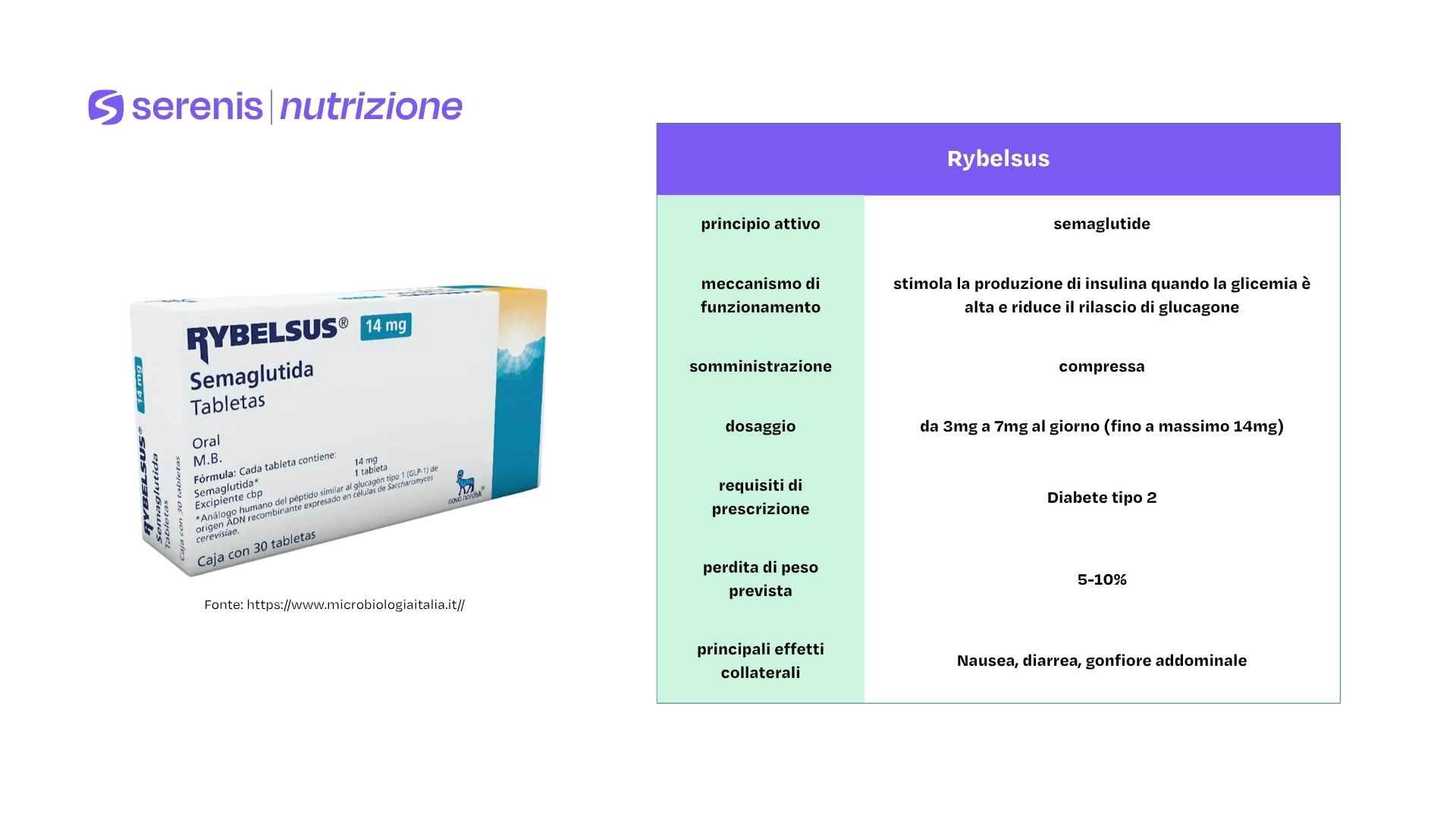 È il primo agonista del recettore GLP-1 (GLP-1 RA) a formulazione orale autorizzato. La sua biodisponibilità è ridotta rispetto alle formulazioni iniettabili, e il farmaco richiede assunzione a stomaco vuoto per ottimizzare l’assorbimento; tuttavia non vi sono dati che indichino che in “alcune persone” risulti “completamente inefficace per trattare il diabete mellito. È importante sottolineare che Rybelsus non è insulina e non sostituisce l’insulina nei pazienti che ne hanno necessità.