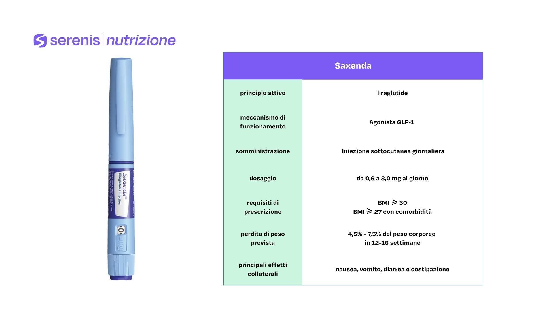 Saxenda è un medicinale iniettabile a base di liraglutide, che viene utilizzato per la gestione del peso. È indicato