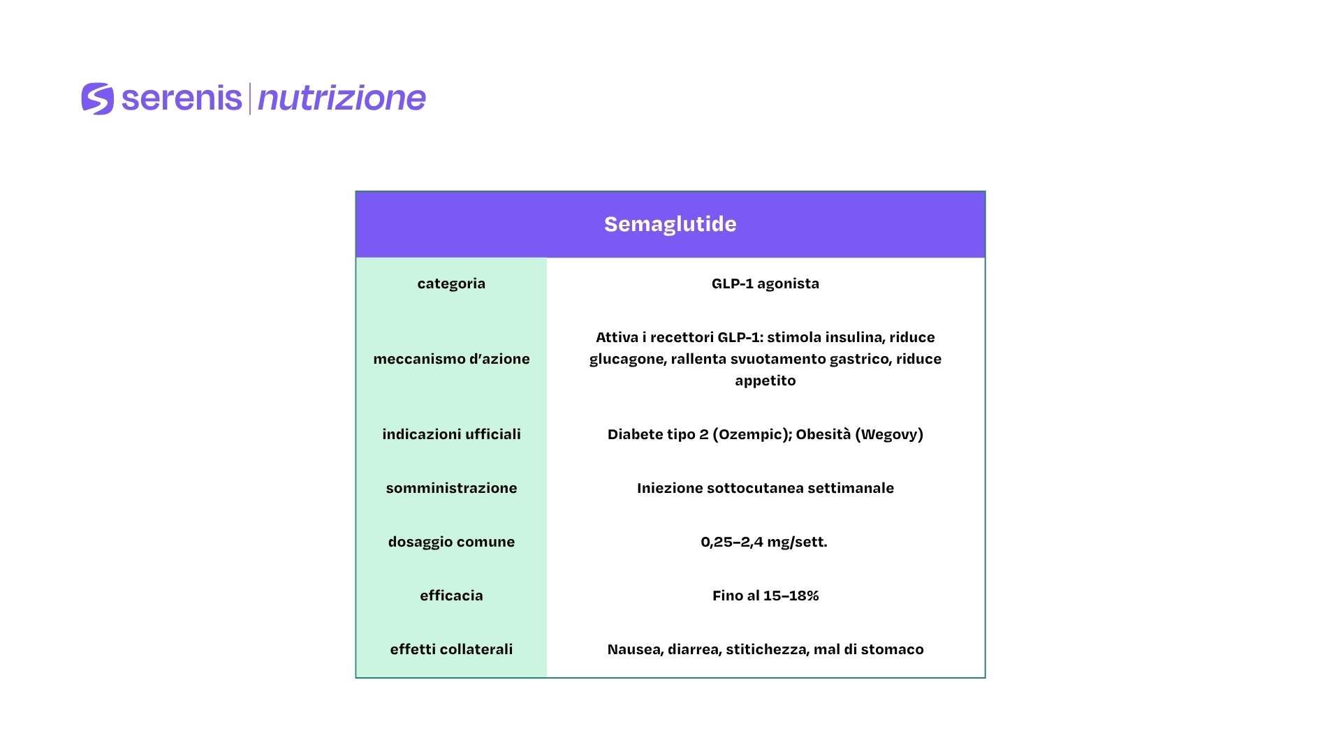 La semaglutide è un agonista del recettore del GLP-1 inizialmente approvato per il trattamento del diabete di tipo 2. Viene inoltre indicato (in formulazione e dosaggio differente) per la gestione dell’obesità in associazione a dieta ed esercizio fisico.