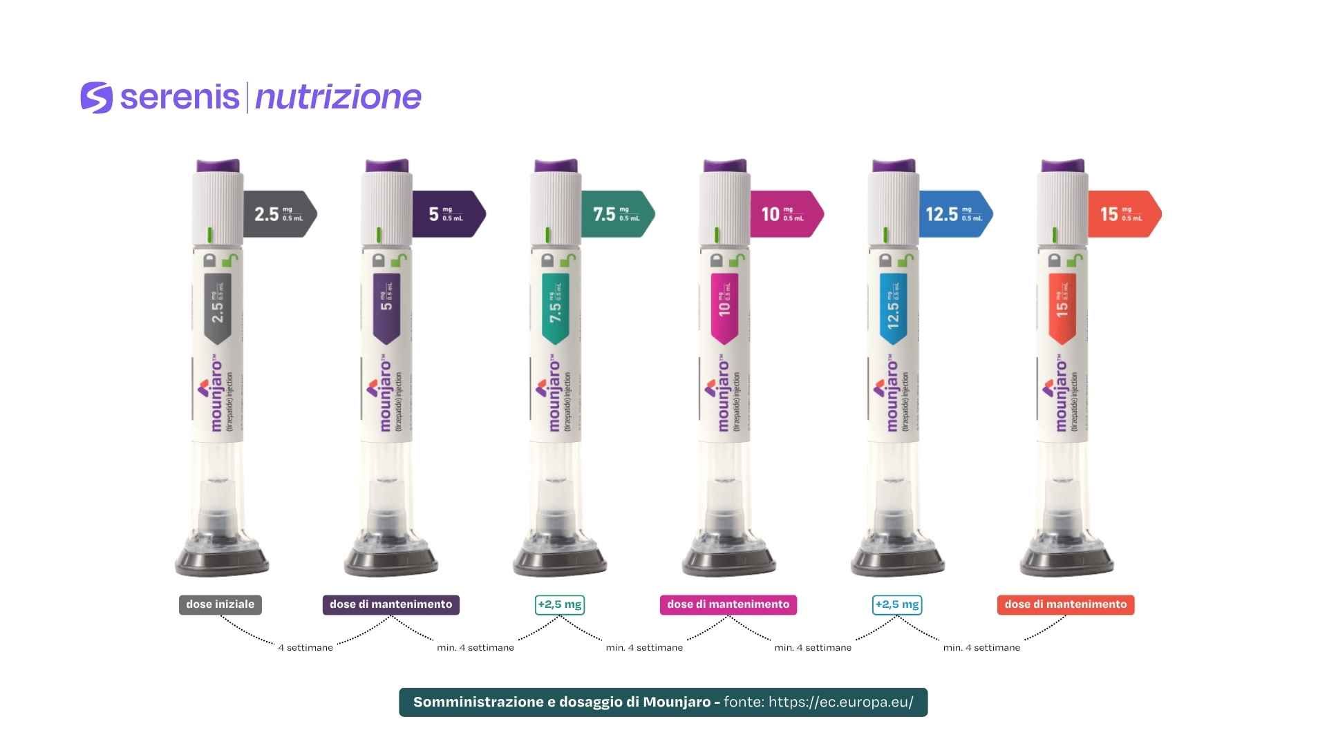 La dose iniziale di tirzepatide è 2,5 mg una volta a settimana. Dopo 4 settimane, la dose deve essere aumentata a 5 mg una volta a settimana. Se necessario, è possibile aumentare la dose con incrementi di 2,5 mg dopo un minimo di 4 settimane con la dose in uso. Le dosi di mantenimento raccomandate sono 5, 10 e 15 mg. La dose massima è 15 mg una volta a settimana.
