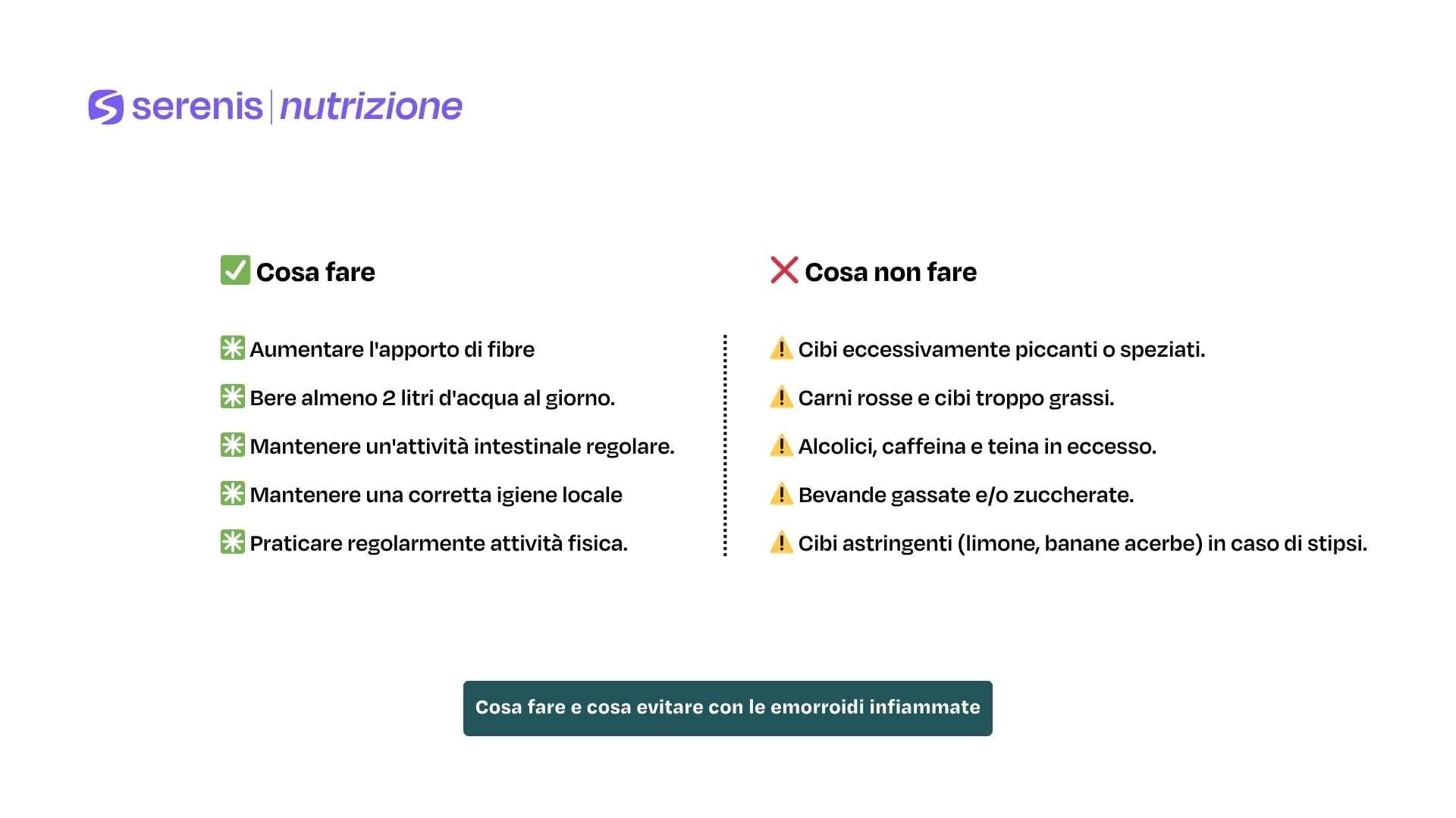 È comunque sempre necessario rivolgersi ad un professionista, che può valutare la casistica del paziente e prescrivere la dieta più adatta ma, per gestire le emorroidi ed evitare il peggioramento o l’insorgere dell’infiammazione, è comunque possibile seguire alcuni consigli: