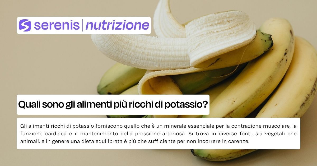 Gli alimenti ricchi di potassio includono frutta, verdura, legumi, frutta secca, pesce e latticini. Il potassio è un minerale importante per la salute di muscoli, cuore e per la pressione sanguigna.