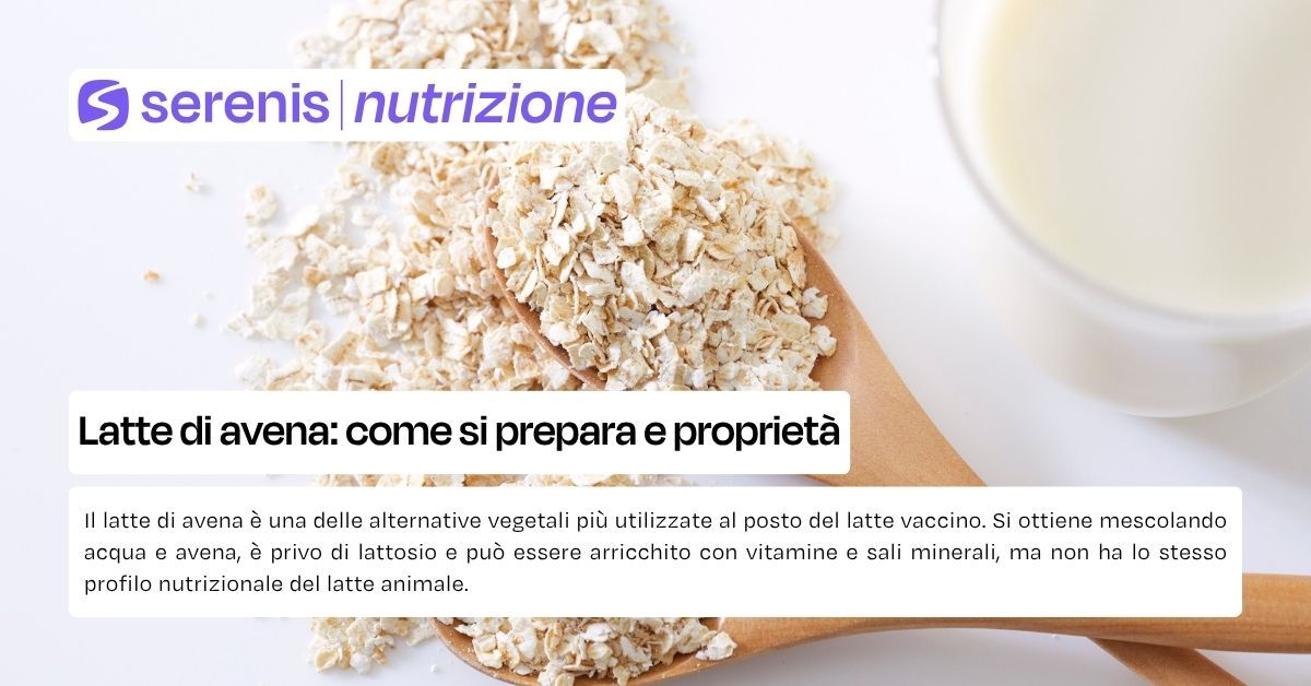 Il latte di avena è una bevanda vegetale ottenuta dall’avena e dall’acqua. È priva di lattosio, facilmente digeribile e ha caratteristiche nutrizionali molto diverse da quelle del latte vaccino.