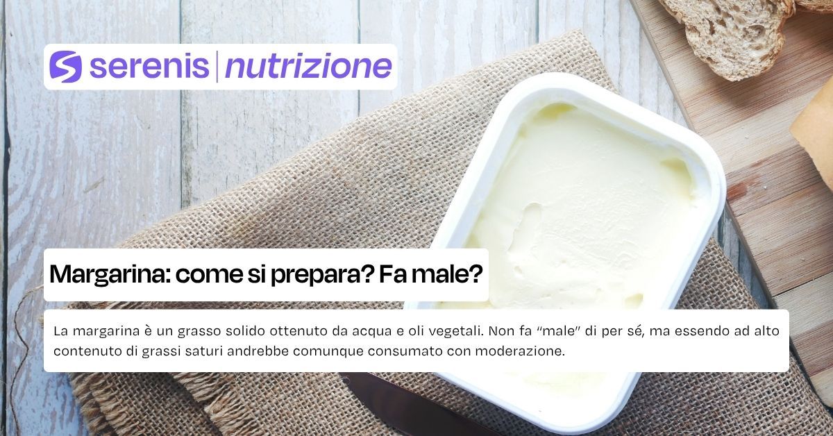 La margarina è un grasso solido ottenuto da acqua e oli vegetali. Non fa “male” di per sé, ma essendo ad alto contenuto di grassi saturi andrebbe comunque consumato con moderazione.